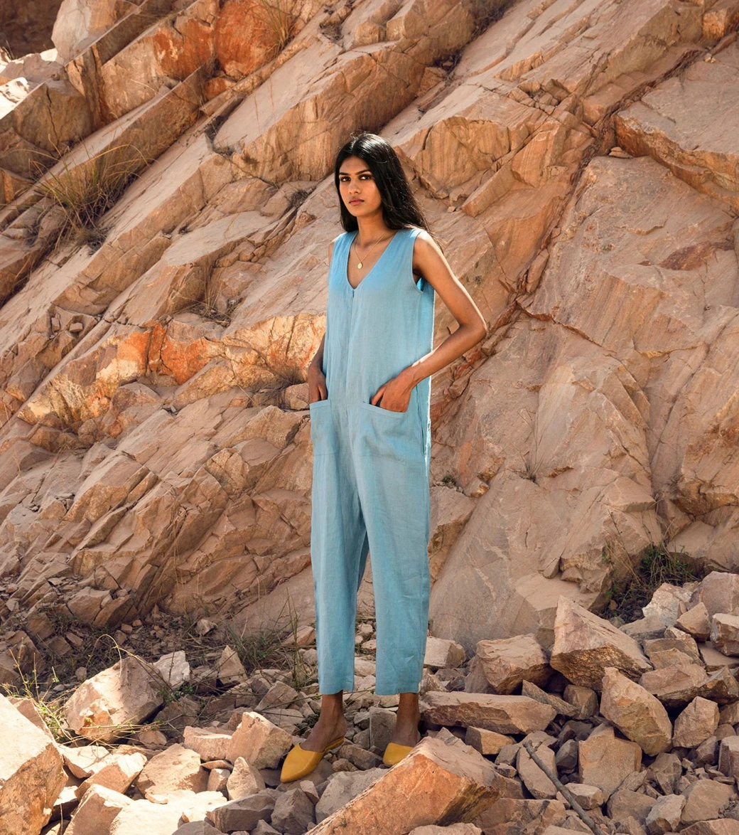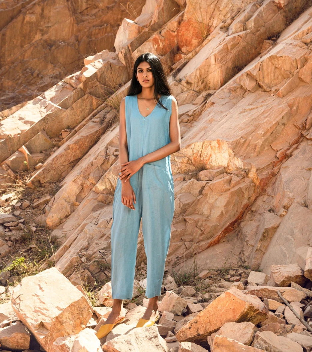 - A sleeveless ice blue linen jumpsuit with a front zipper and pockets