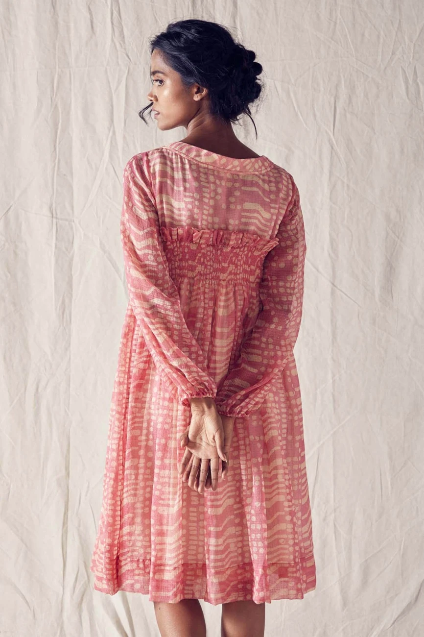 - Smock detail yoke dress in batik printed kota doria transluscent fabric falling gently over khadi checks inner layer