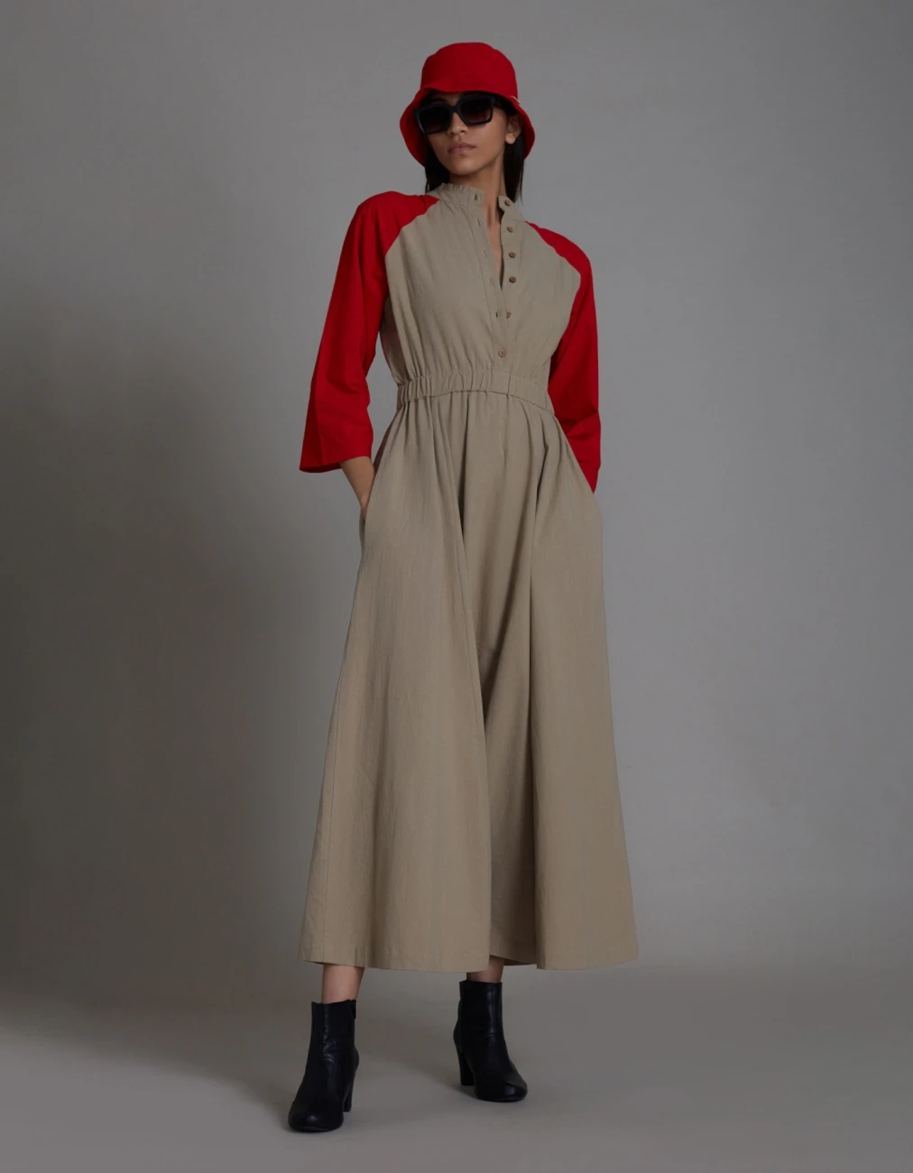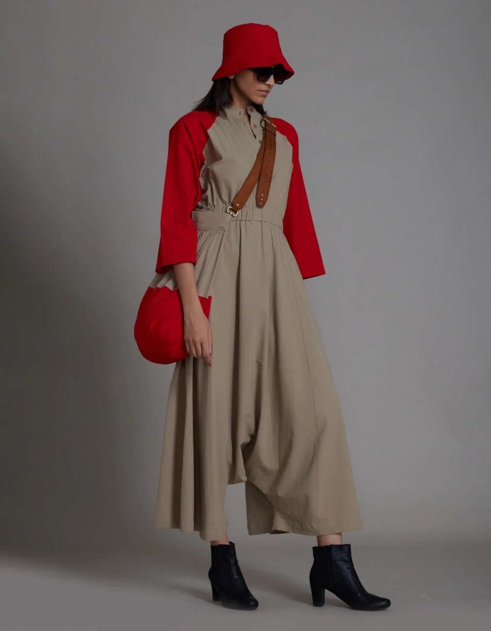 - A raglan sphara jumpsuit with contrast colour sleeves, ruffled collar and side pockets