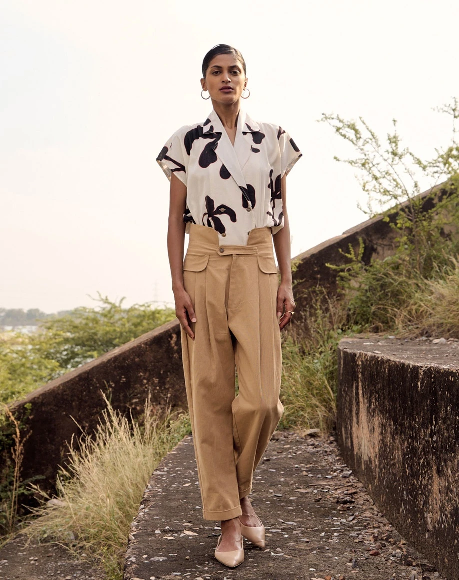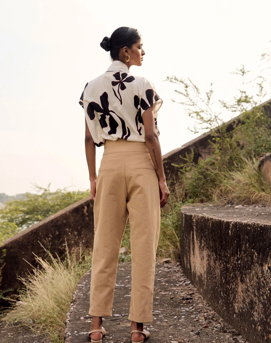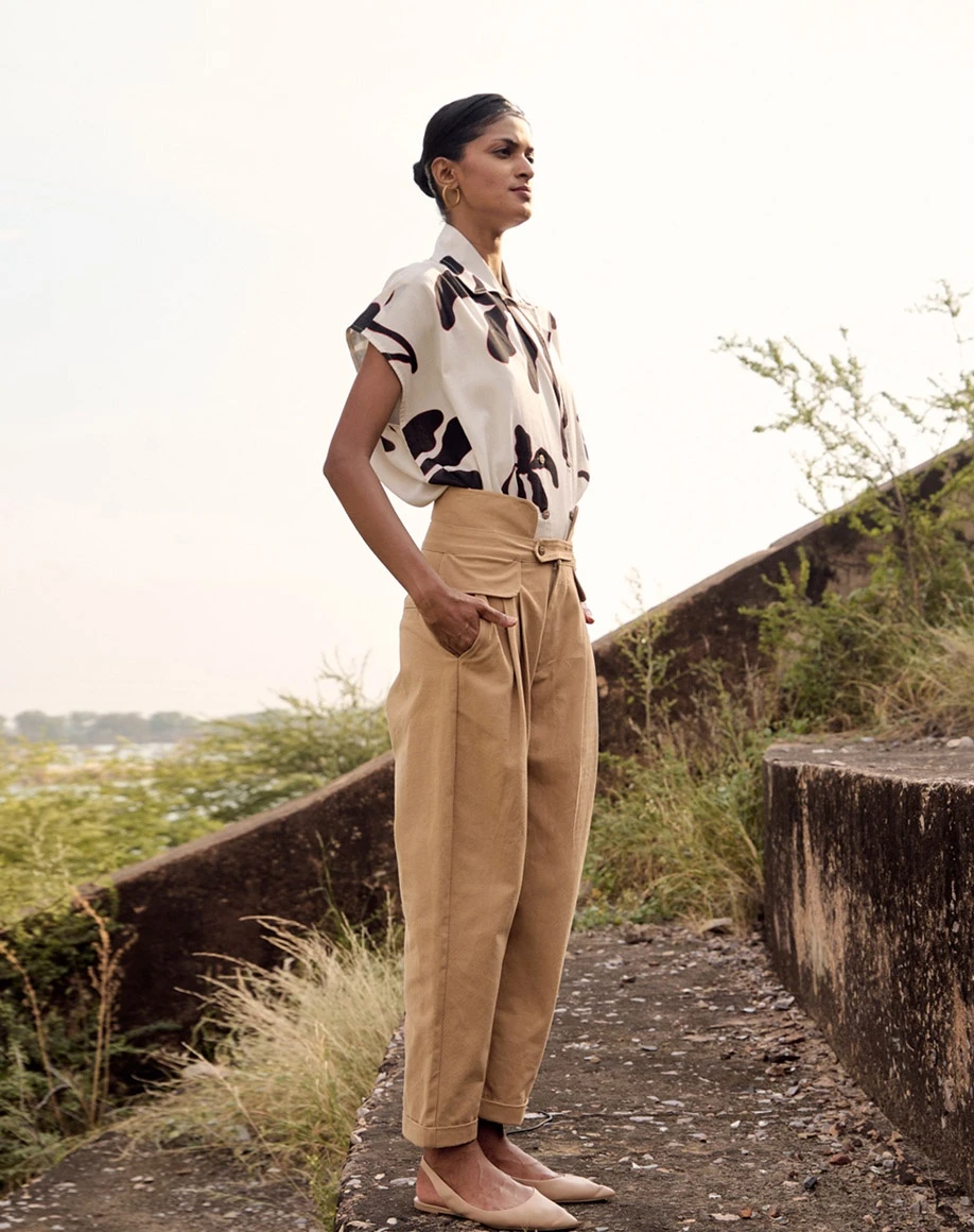 - A beige oxford trousers with front pleat detailing and front button opening