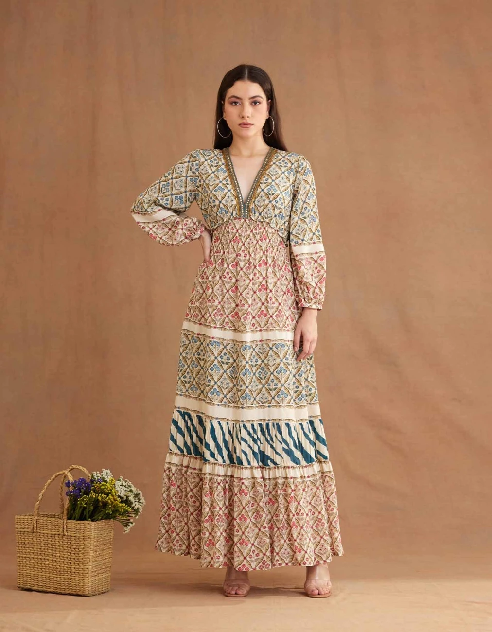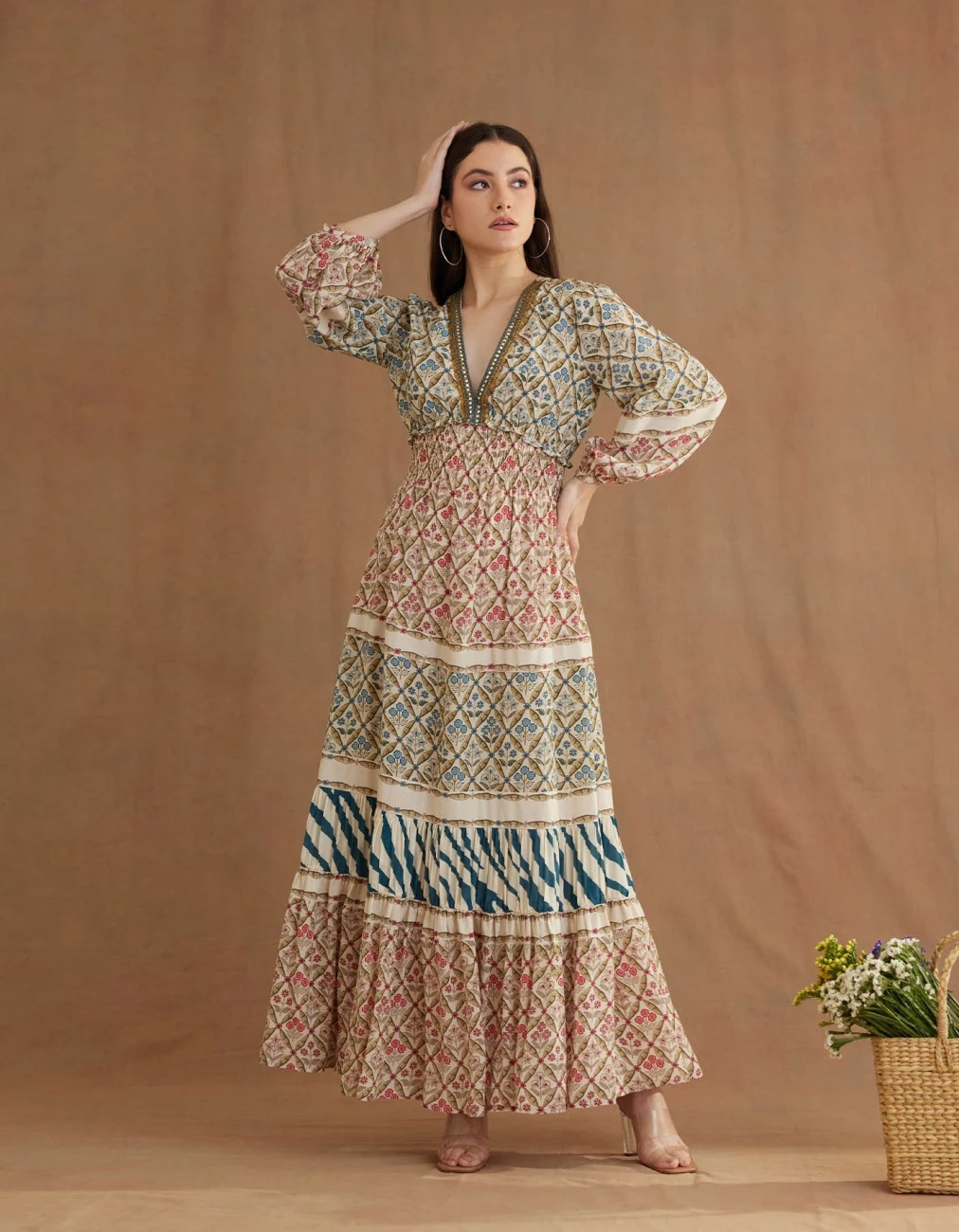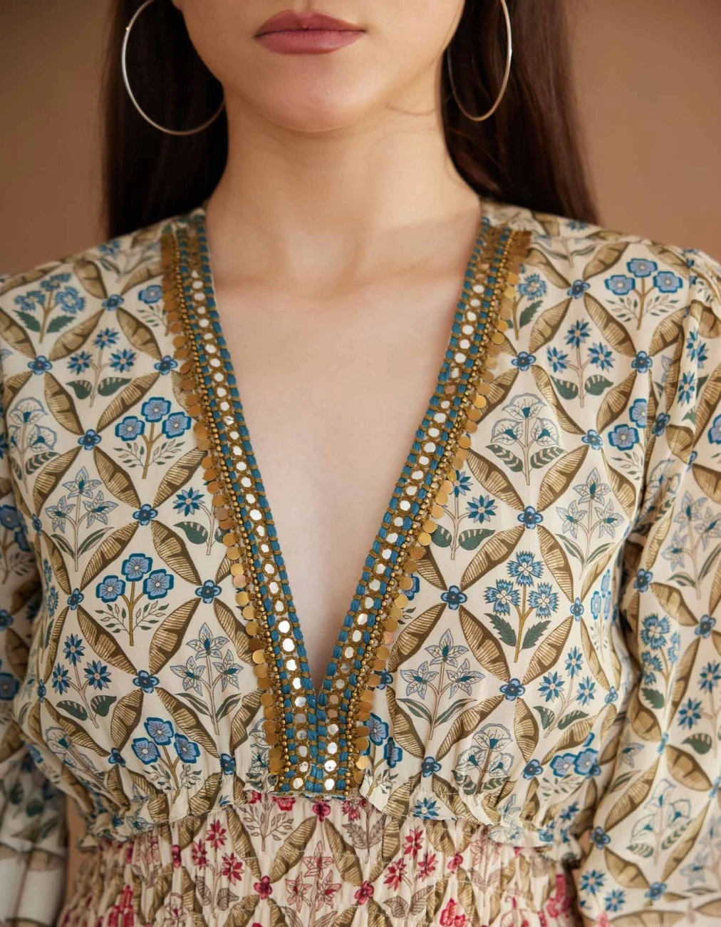 - Antique brass sequins and mirror embroidery details on the neckline and rouching at the waist