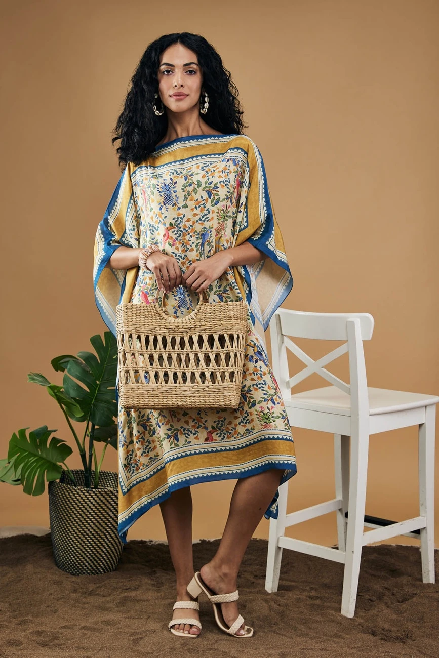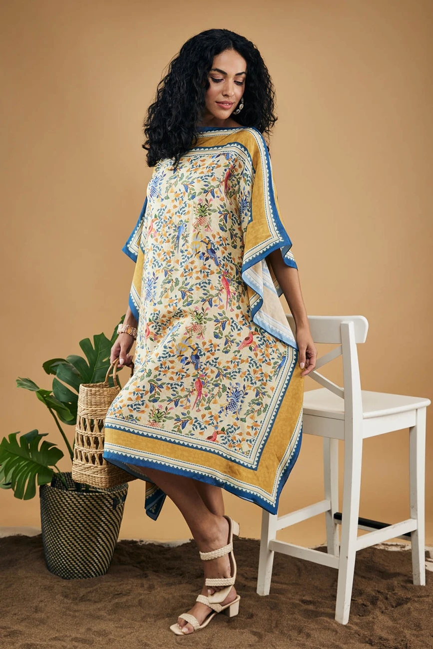 - Bird and tile printed kaftan dress