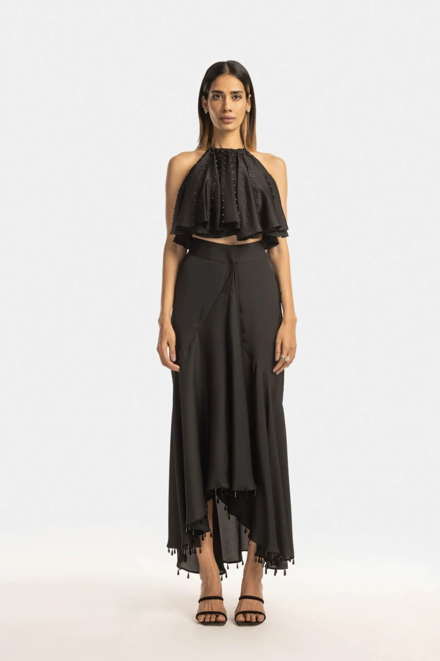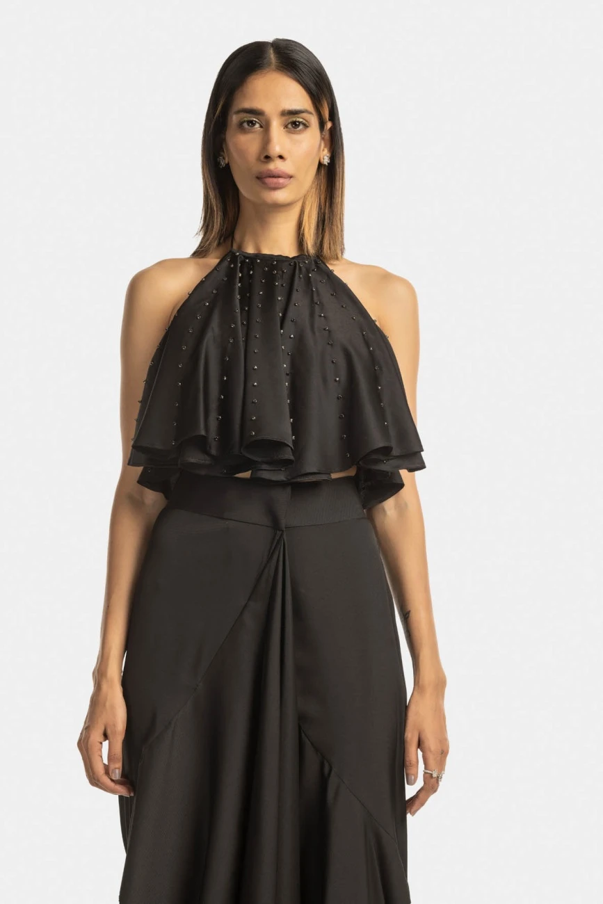 - Halter ruffle top with a flared hem