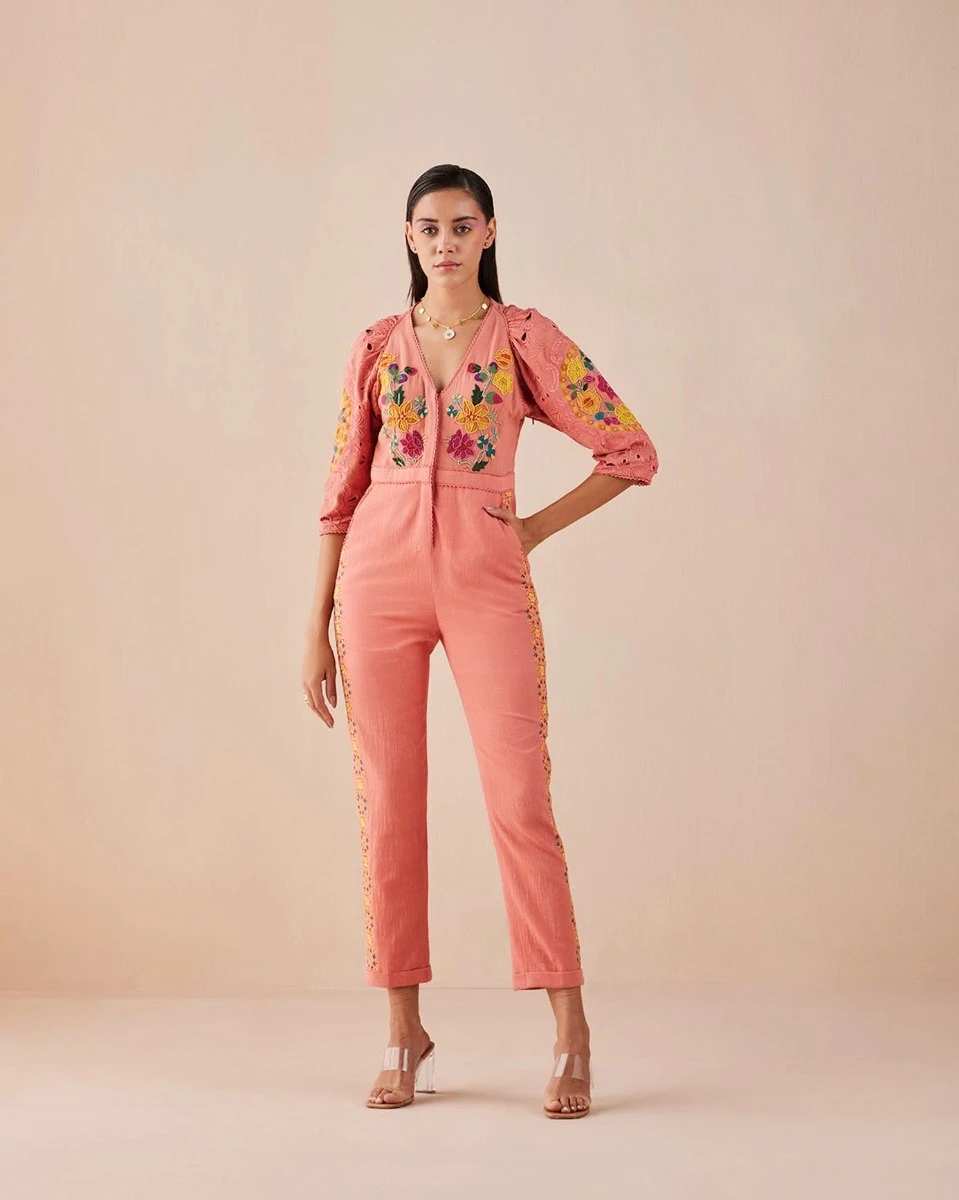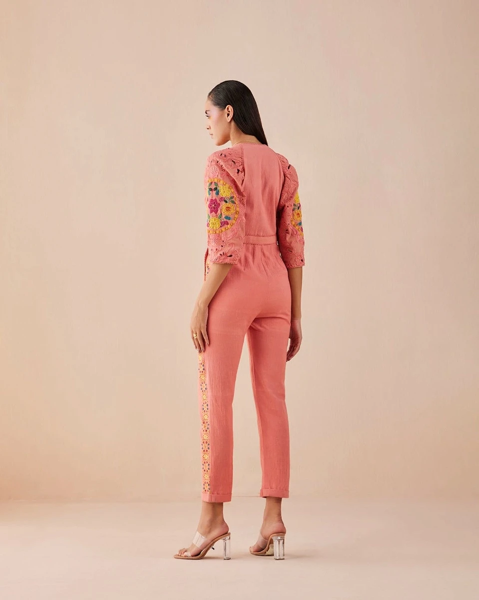 - Blush kalacotton jumpsuit with floral applique, beadwork and cutwork detail