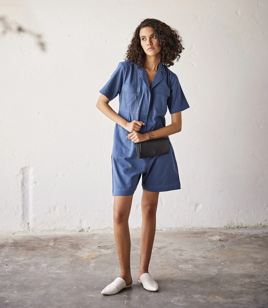 - A yale blue cotton herringbone jumpsuit with a front zipper opening