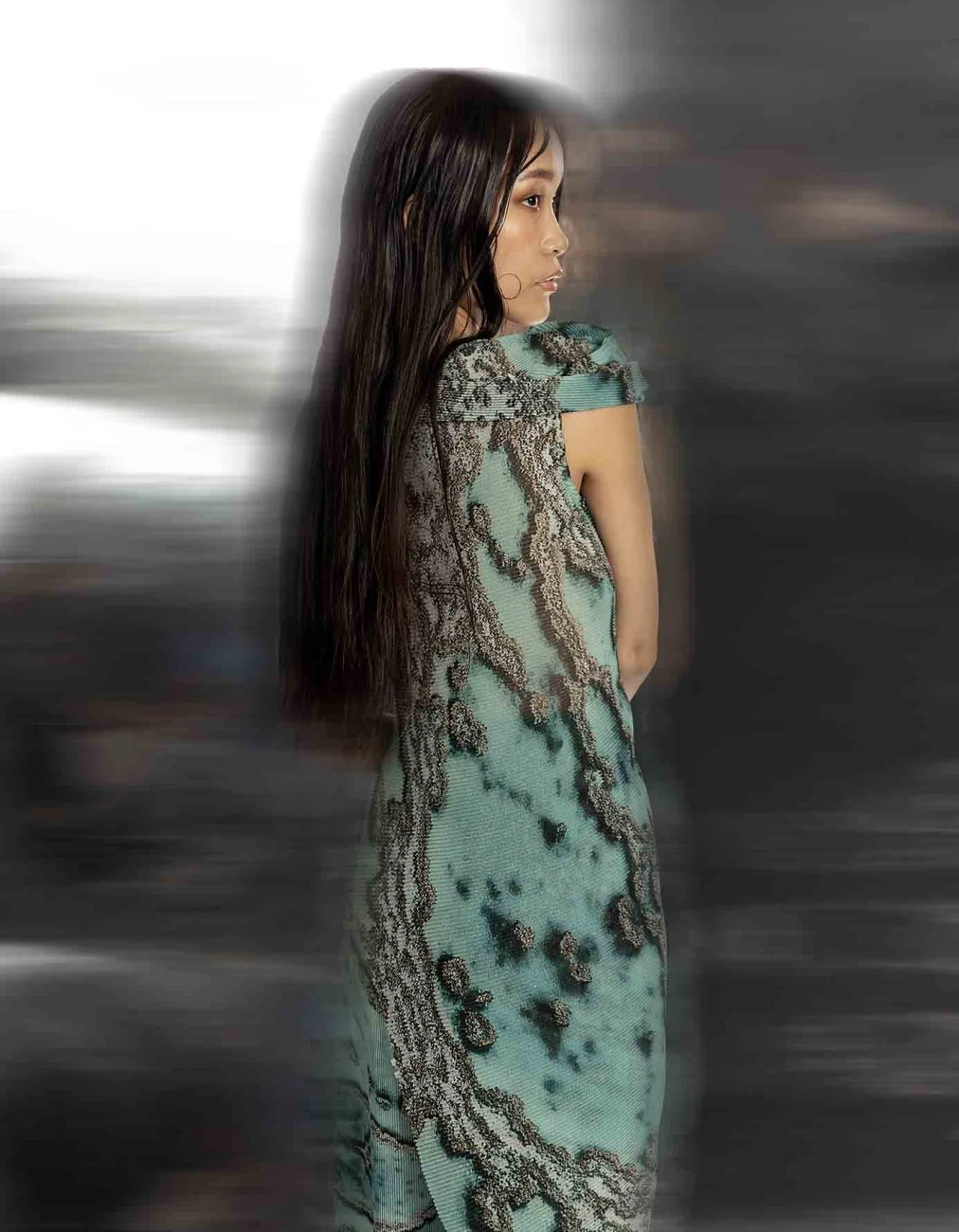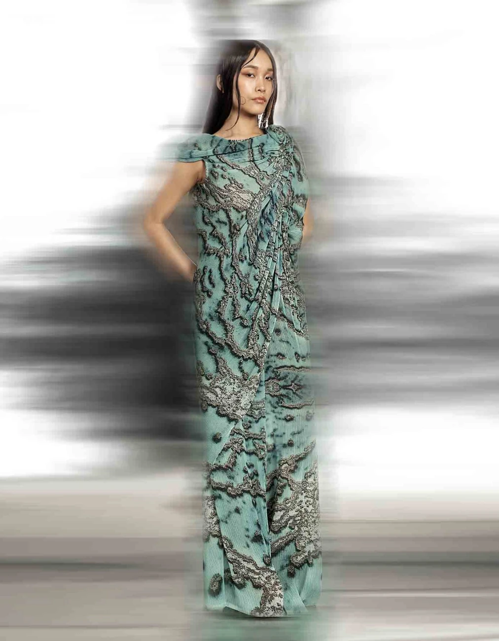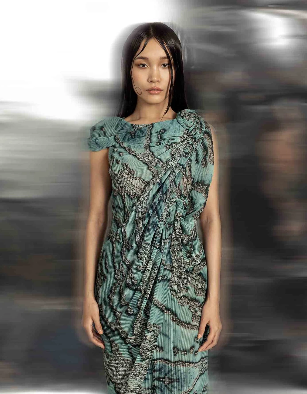 - Reef printed pleated fluid wave draped georgette top with exaggerated neck