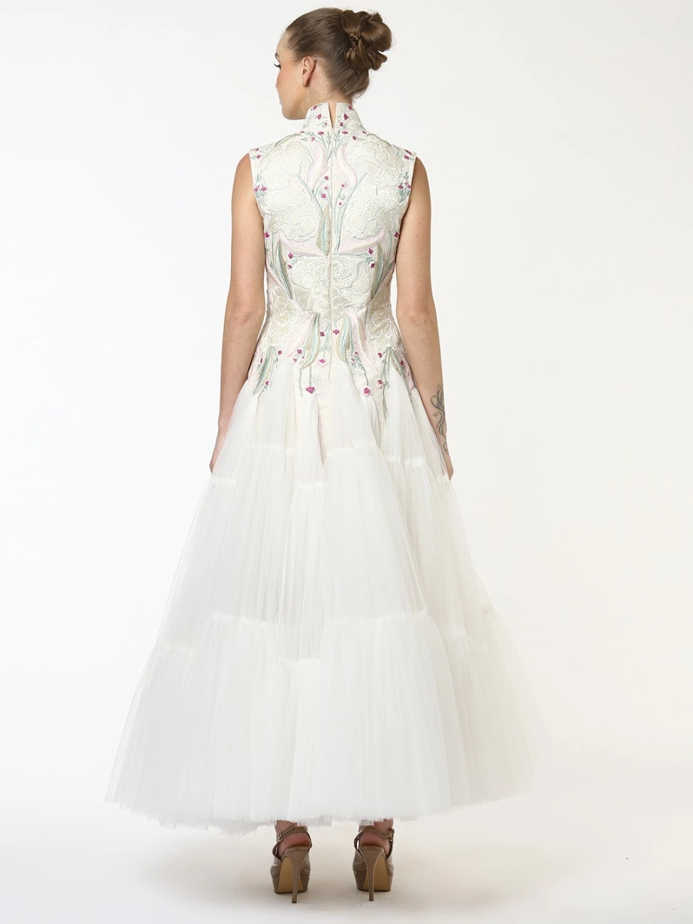 - Ivory collared mesh panel detailing cotton silk gown embroidered with floral motifs of silk & zari yarn