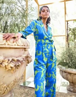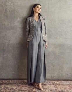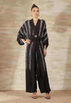 - Flared Jumpsuit with embroidered yok, and transparent embellished side Kalis With back cut on the waist