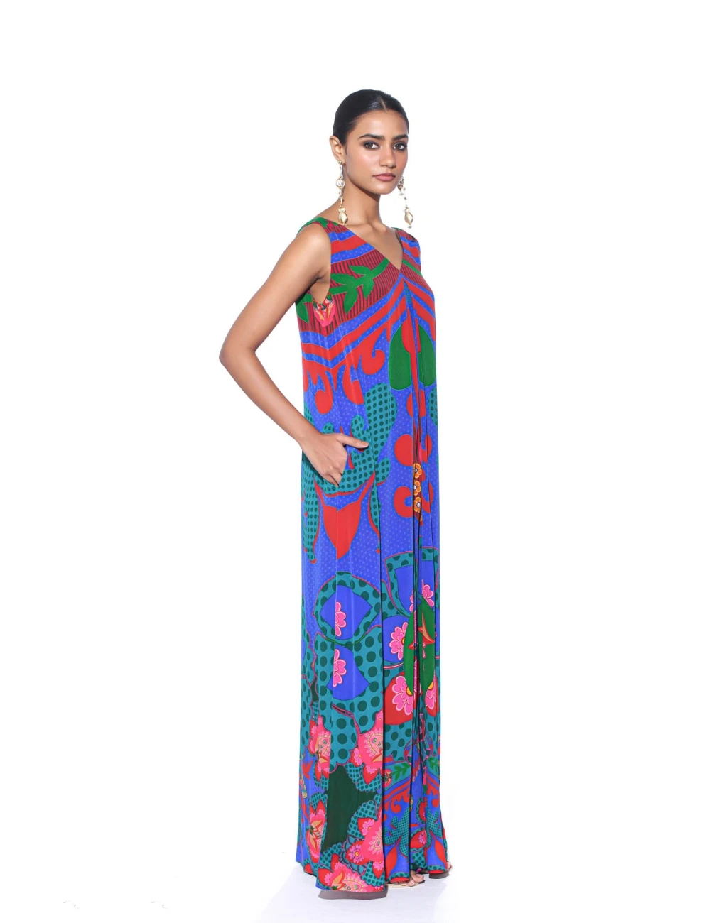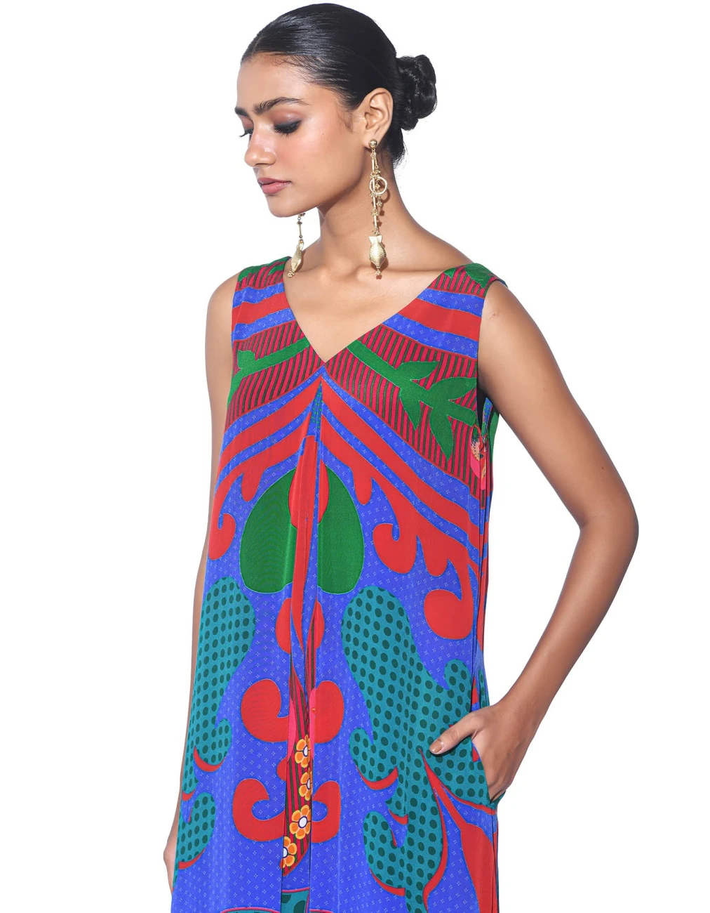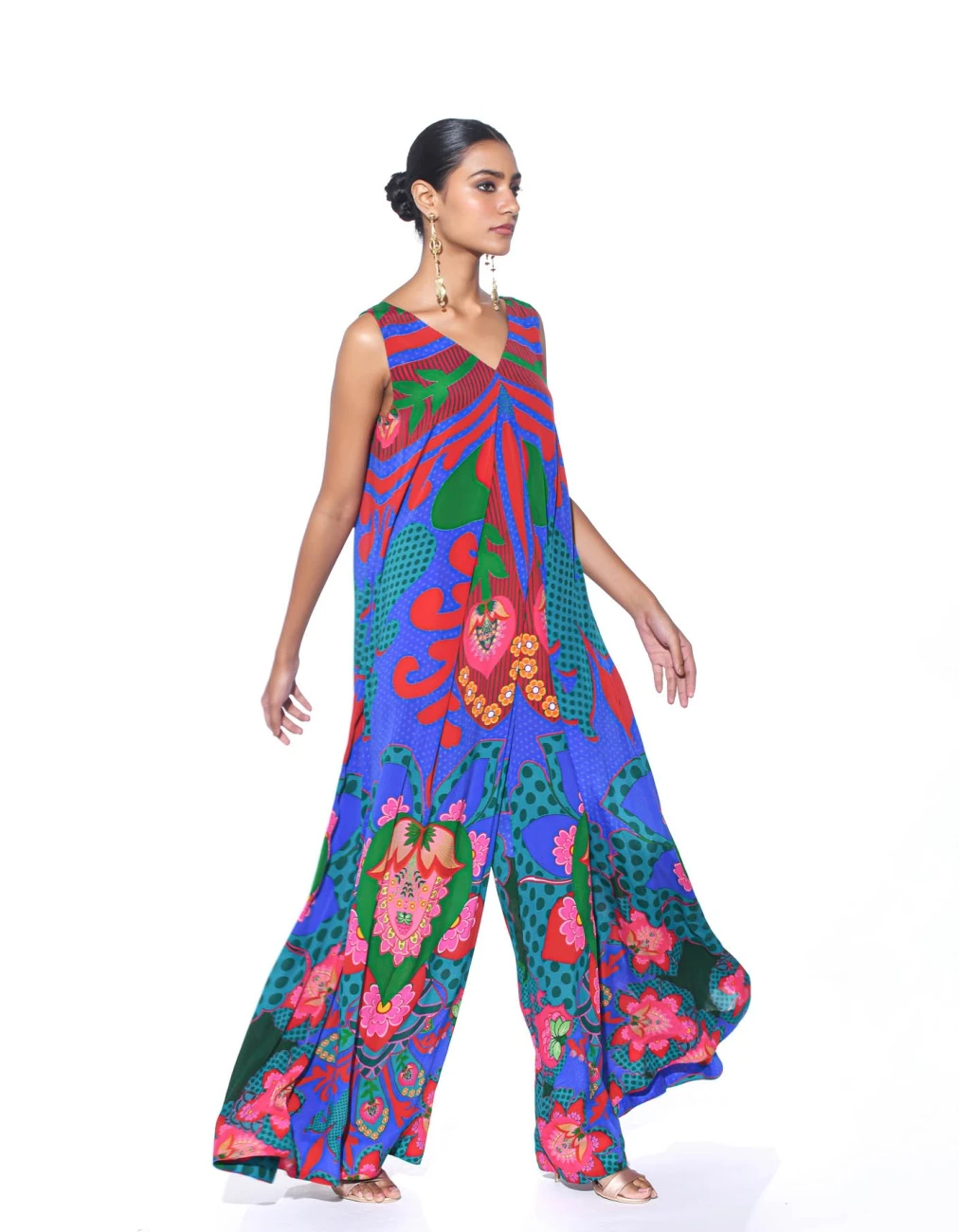 - Electric blue Royal paisly inverted box pleat, wide leg jupmsuit