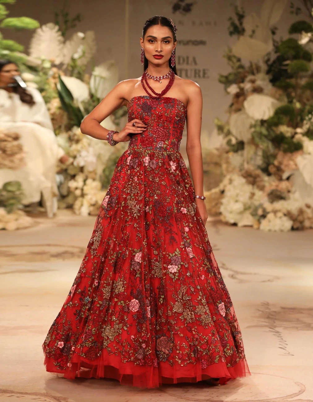 - This gown features a tube neck and a captivating ball gown silhouette in ember red