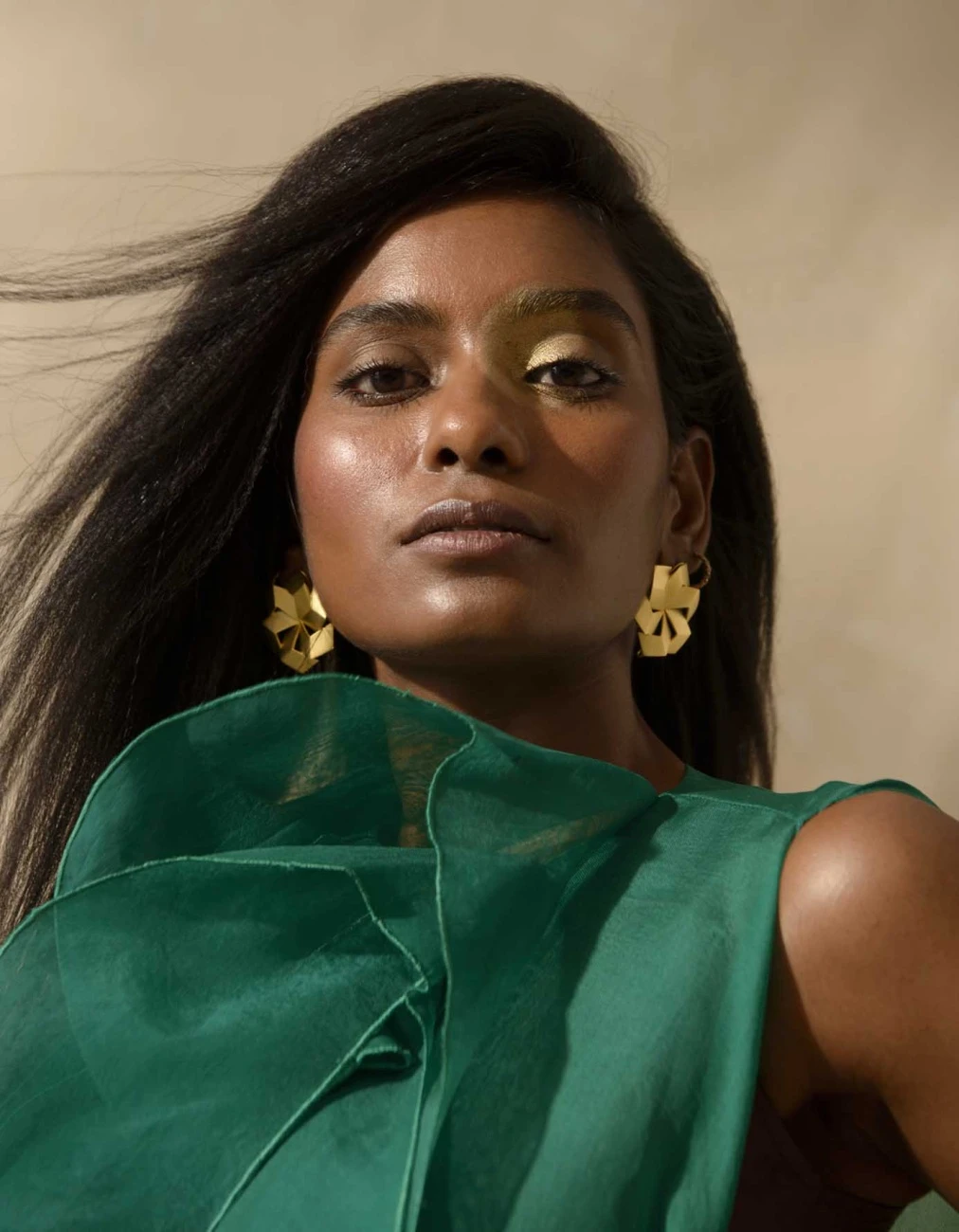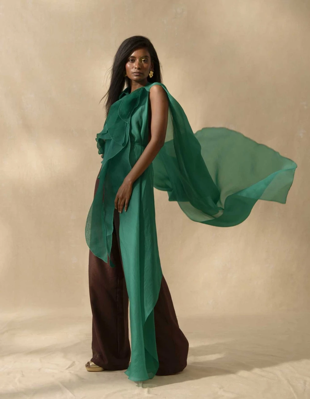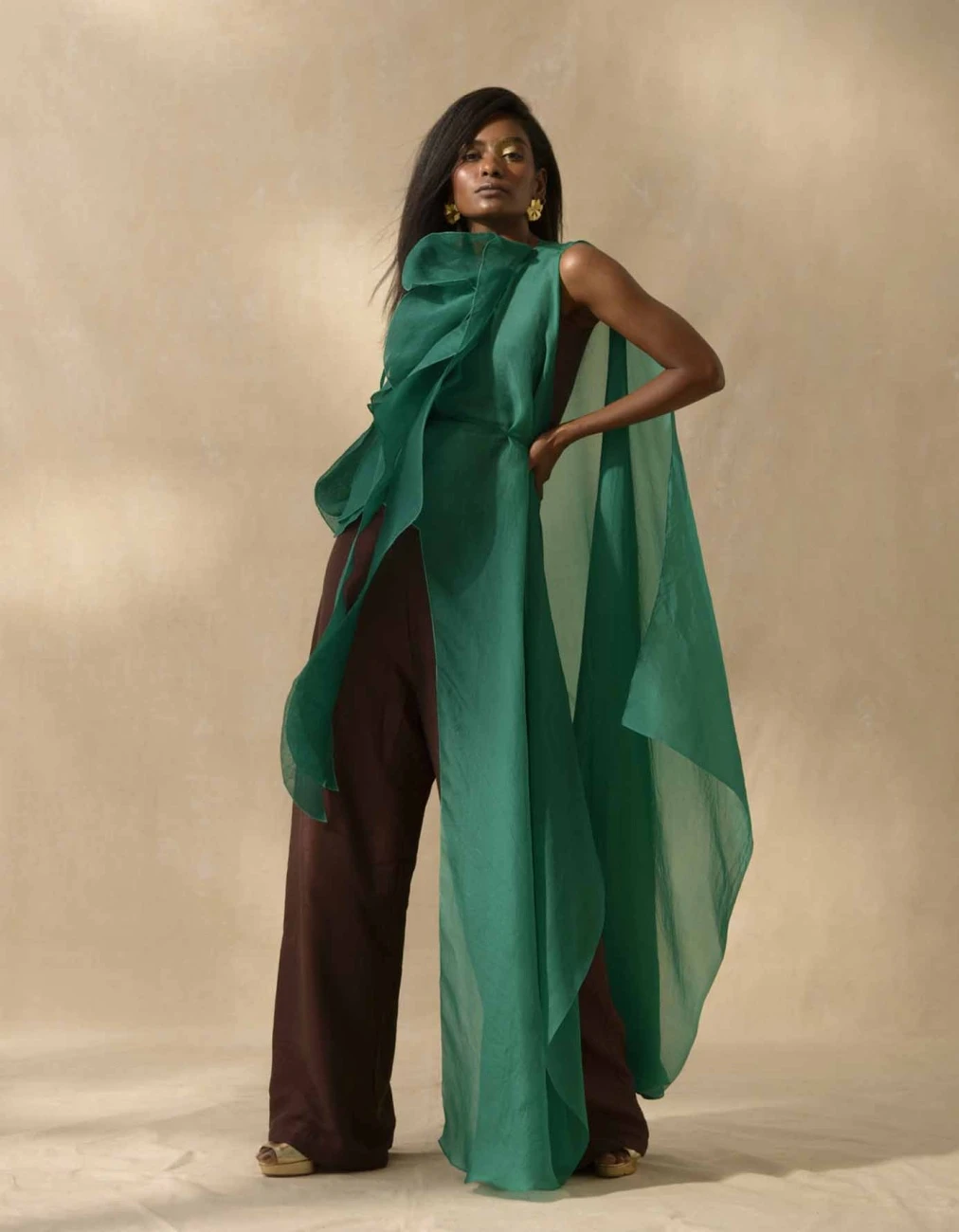 - Emerald Green Ruffle Overlay With Dark Brown Jumpsuit