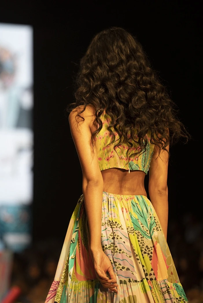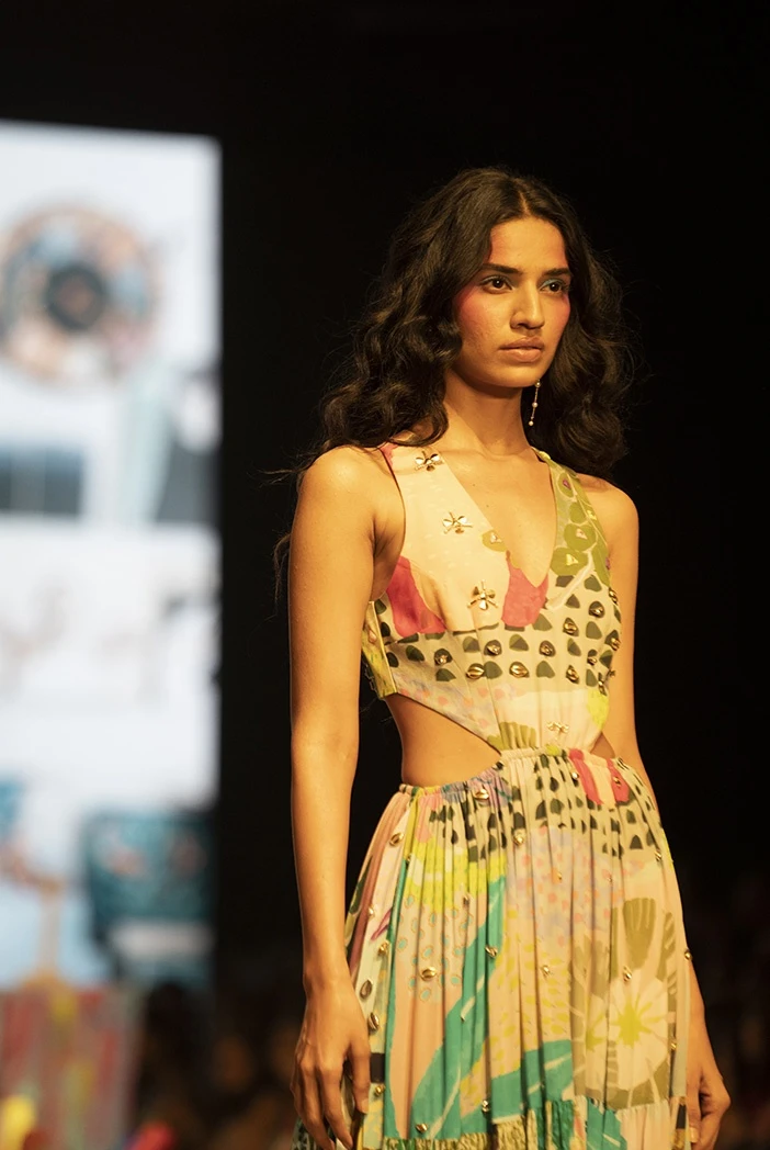 - Tropical print georgette embroidered cut-out dress.