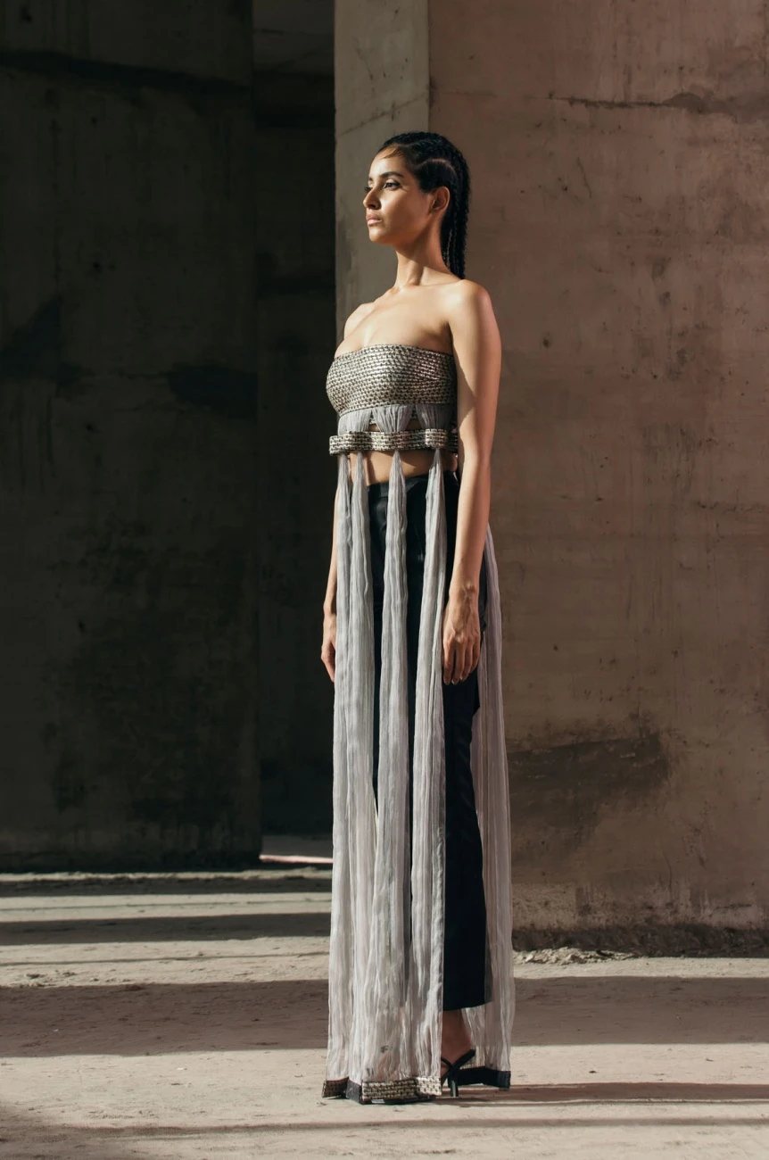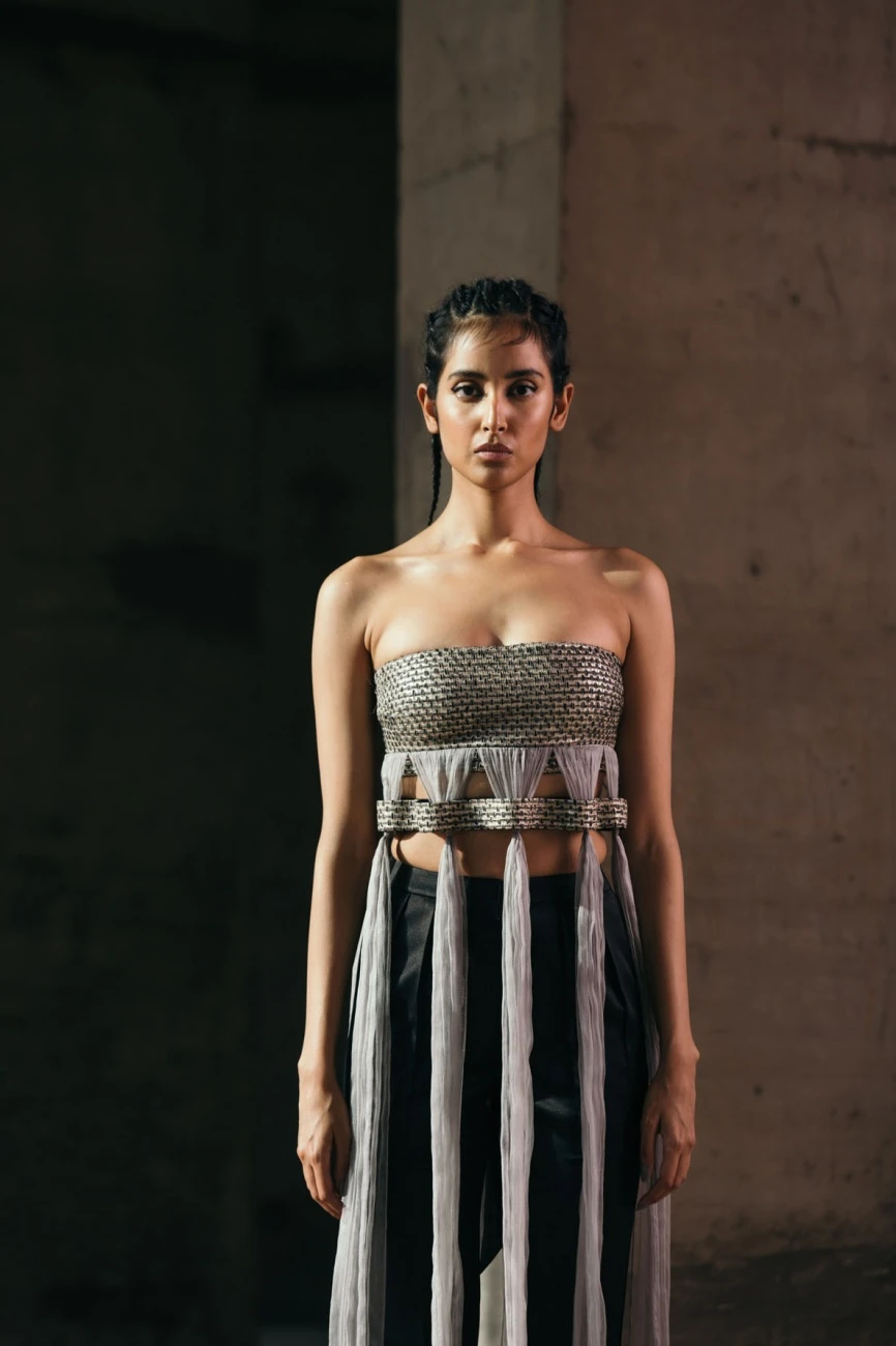 - Handwoven and hand-embroidered silk raffia strapless bustier