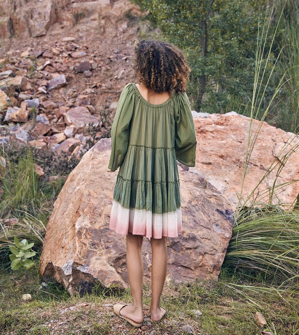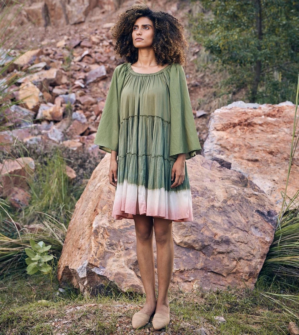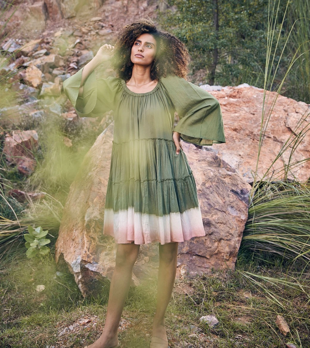 - A tiered dress with an elasticated neckline that can also be worn as an off-shoulder dress and a hemline that is dip-dyed.