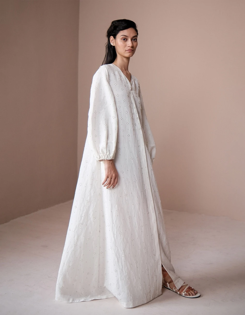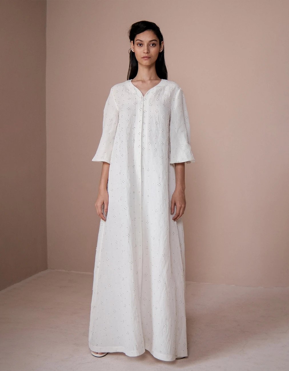- Long dress made in linen with glass bead embroidery
