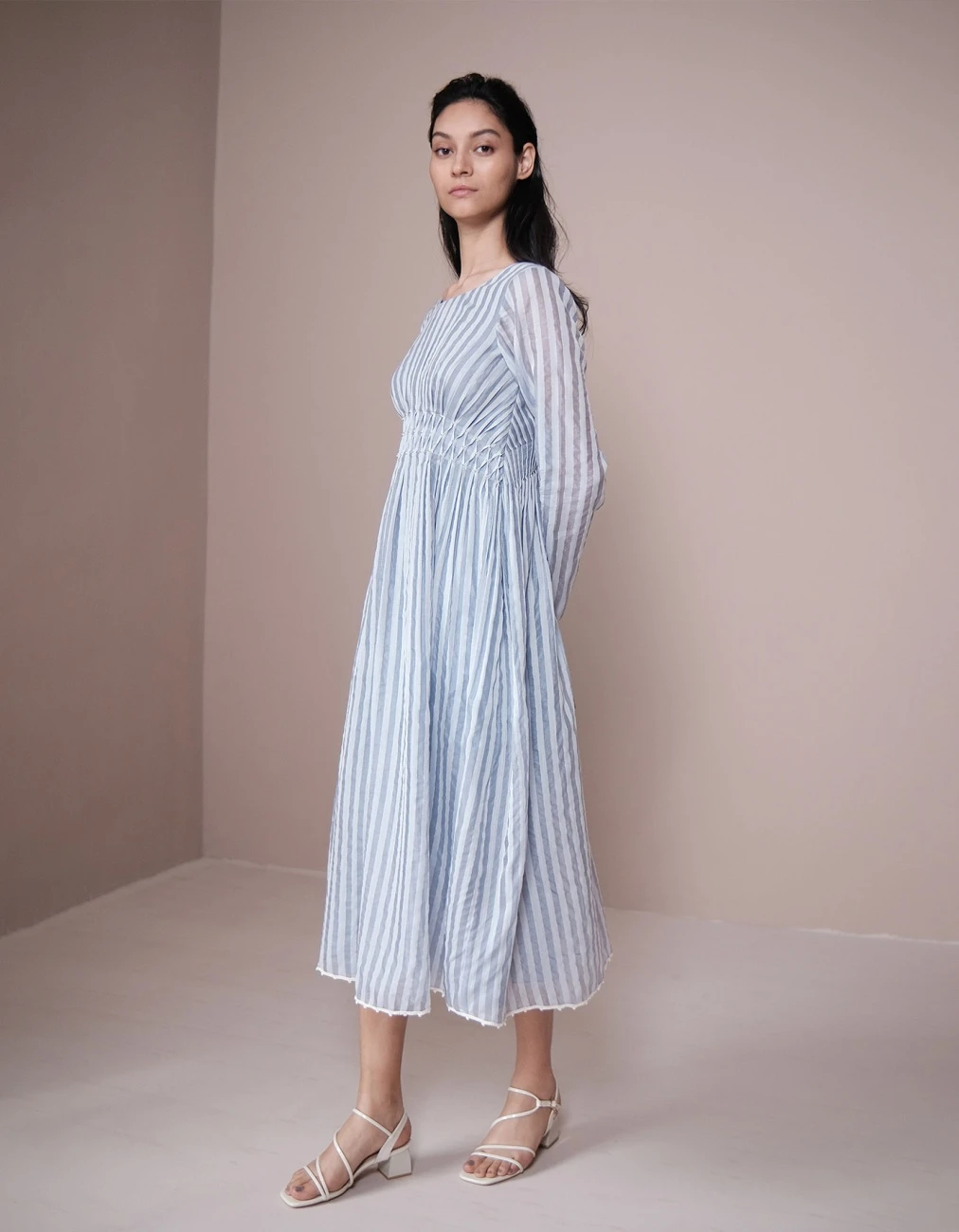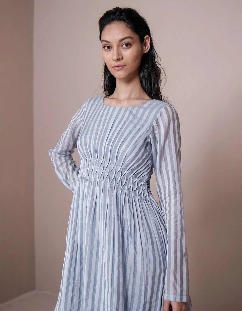 - Dress made in yard dyed, striped handwoven chanderi