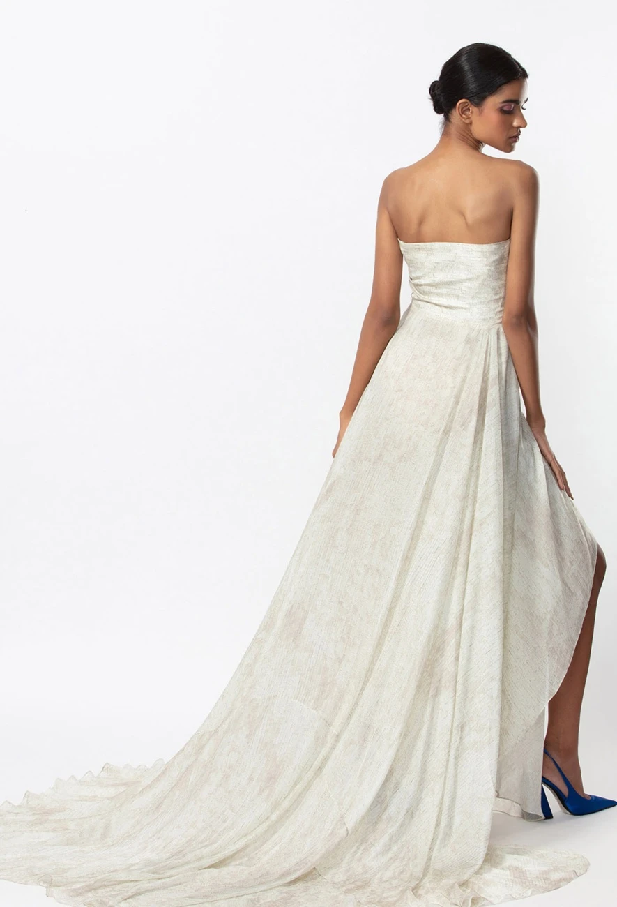 - Gown : Abstract Print Asymmetric Gown With Hand Embroidered Mirror And Thread Work Detailing And Exaggerated Trail