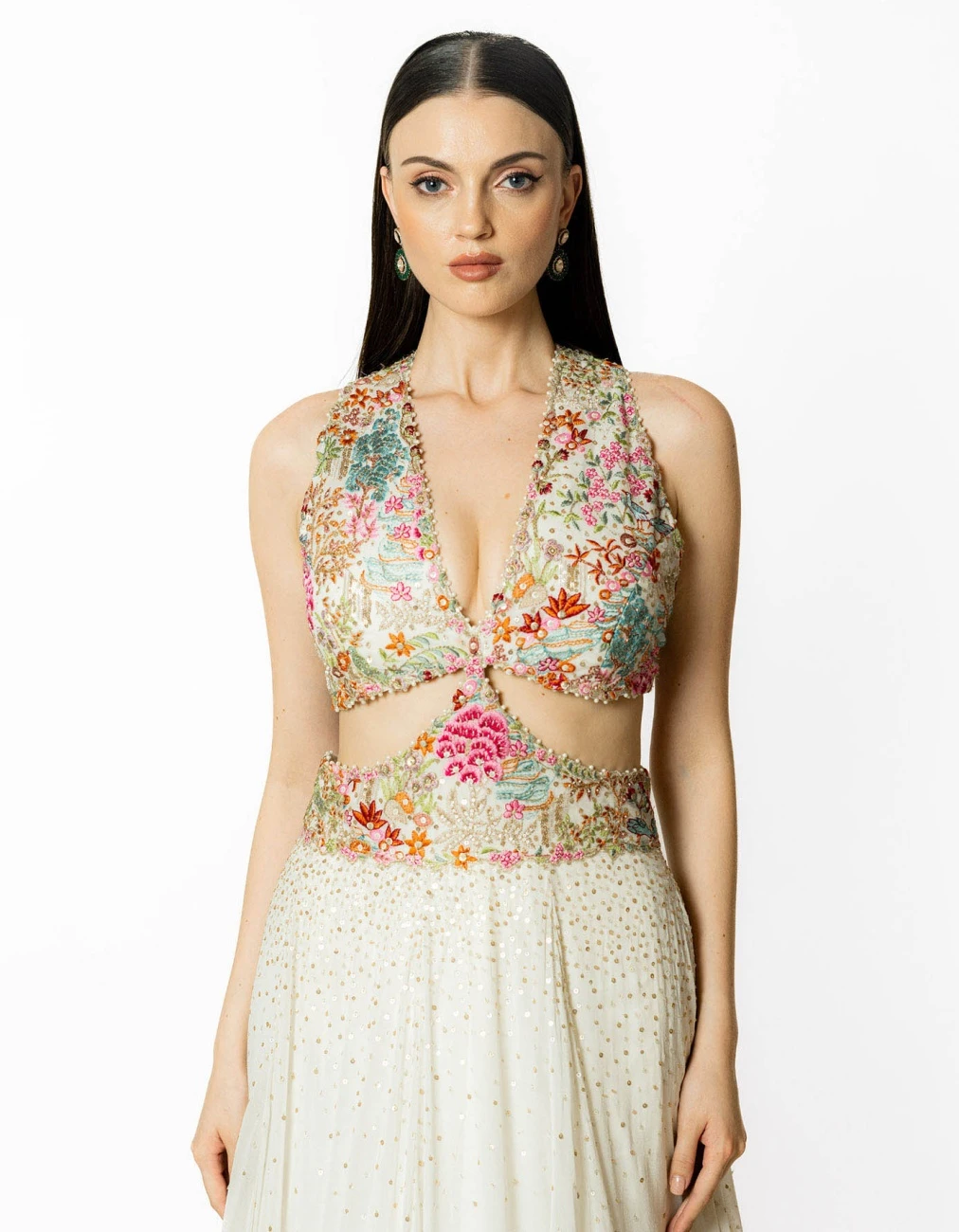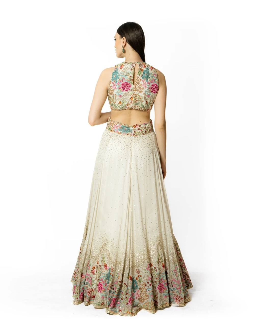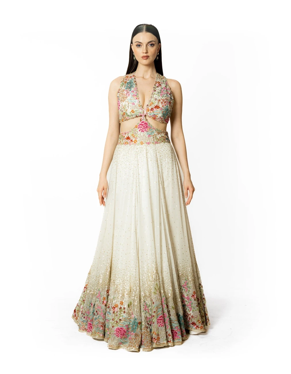 - Ivory georgette multi resham and sequin embroidered gown