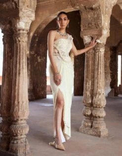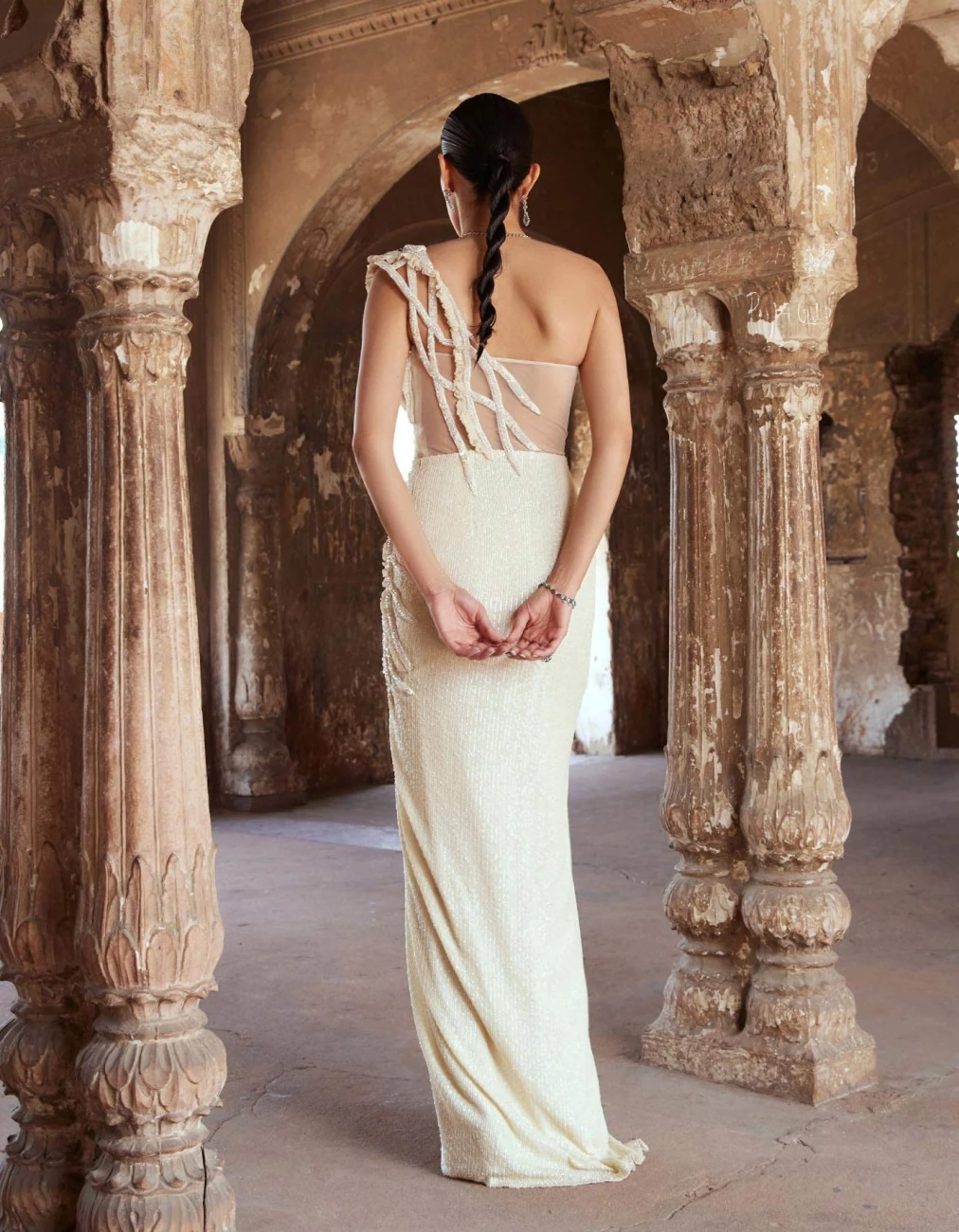 - Ivory concept saree gown with embellishments on bodice and cutout 3d details