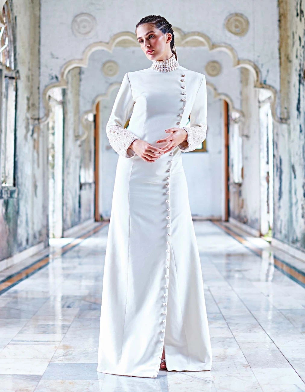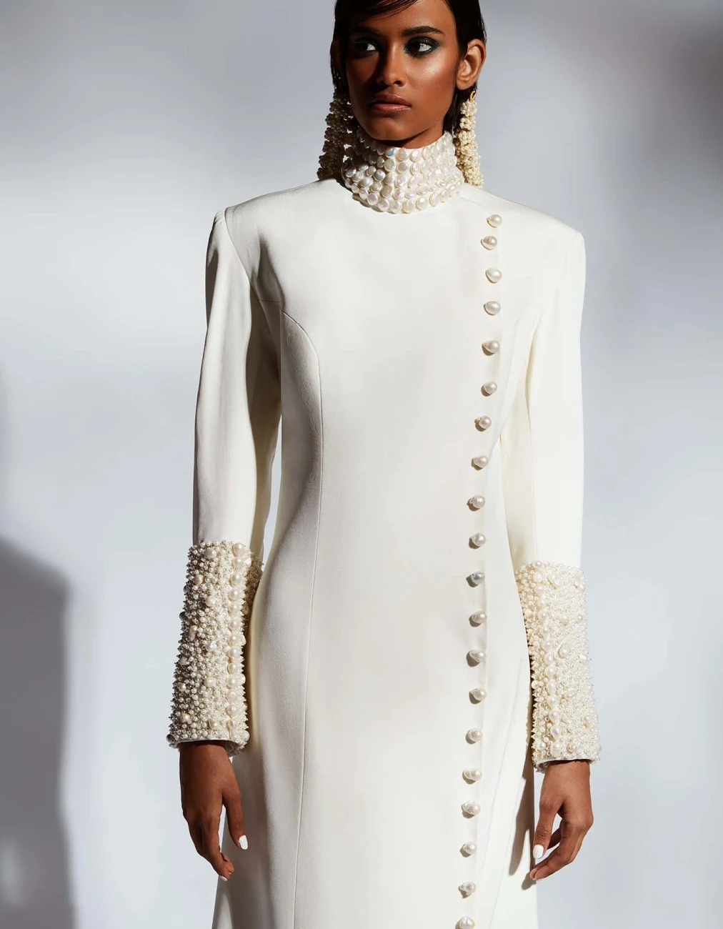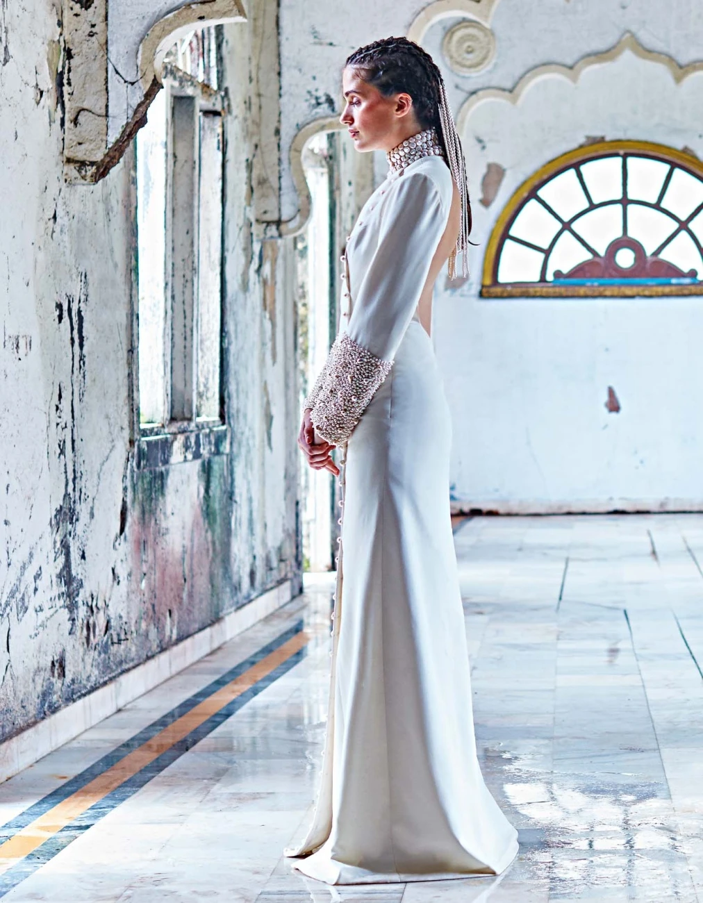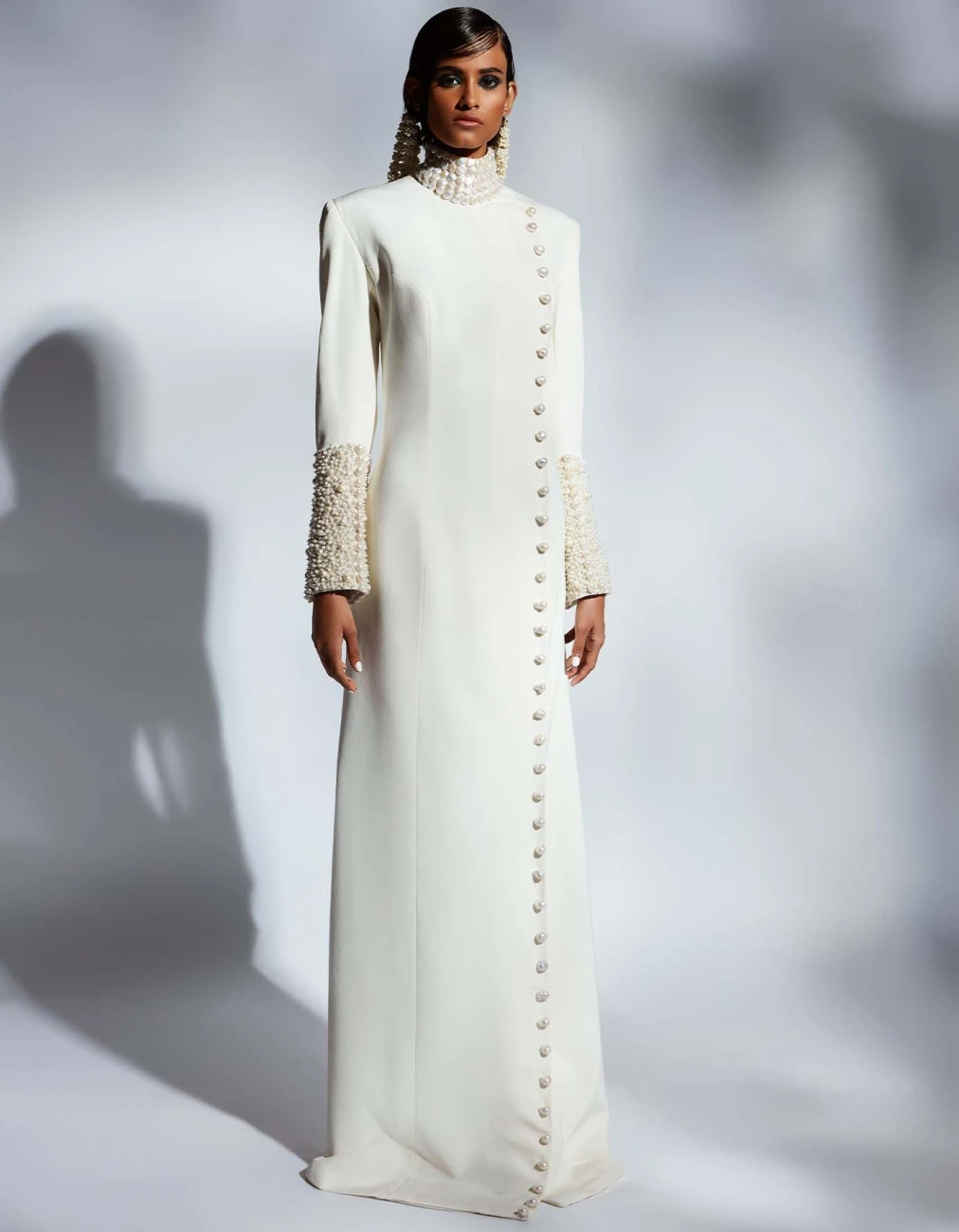 - Crepe gown with real pearls embellished on the collar body with beaded cuffs