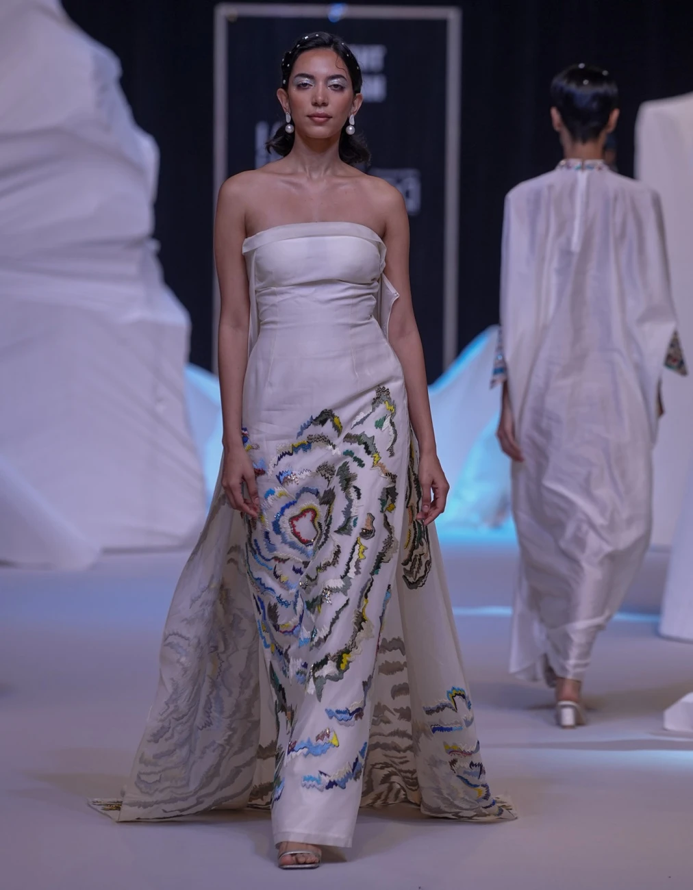 - Ivory cotton silk off shoulder gown inhanced with color full geometrical embroidery