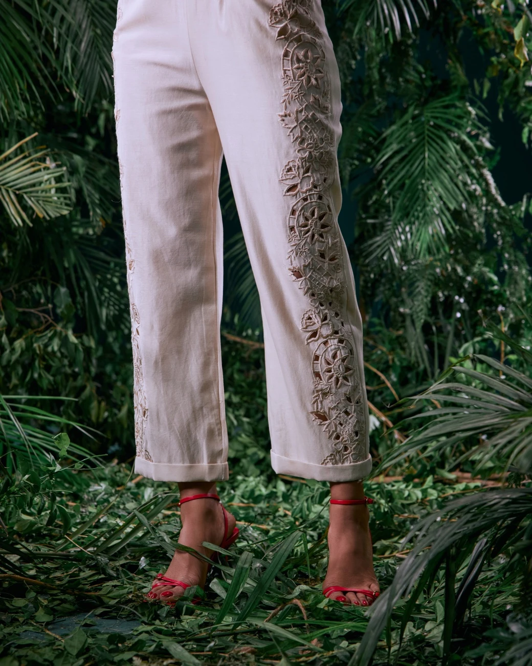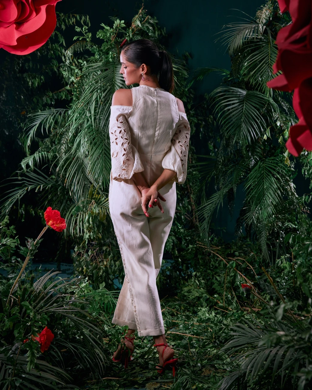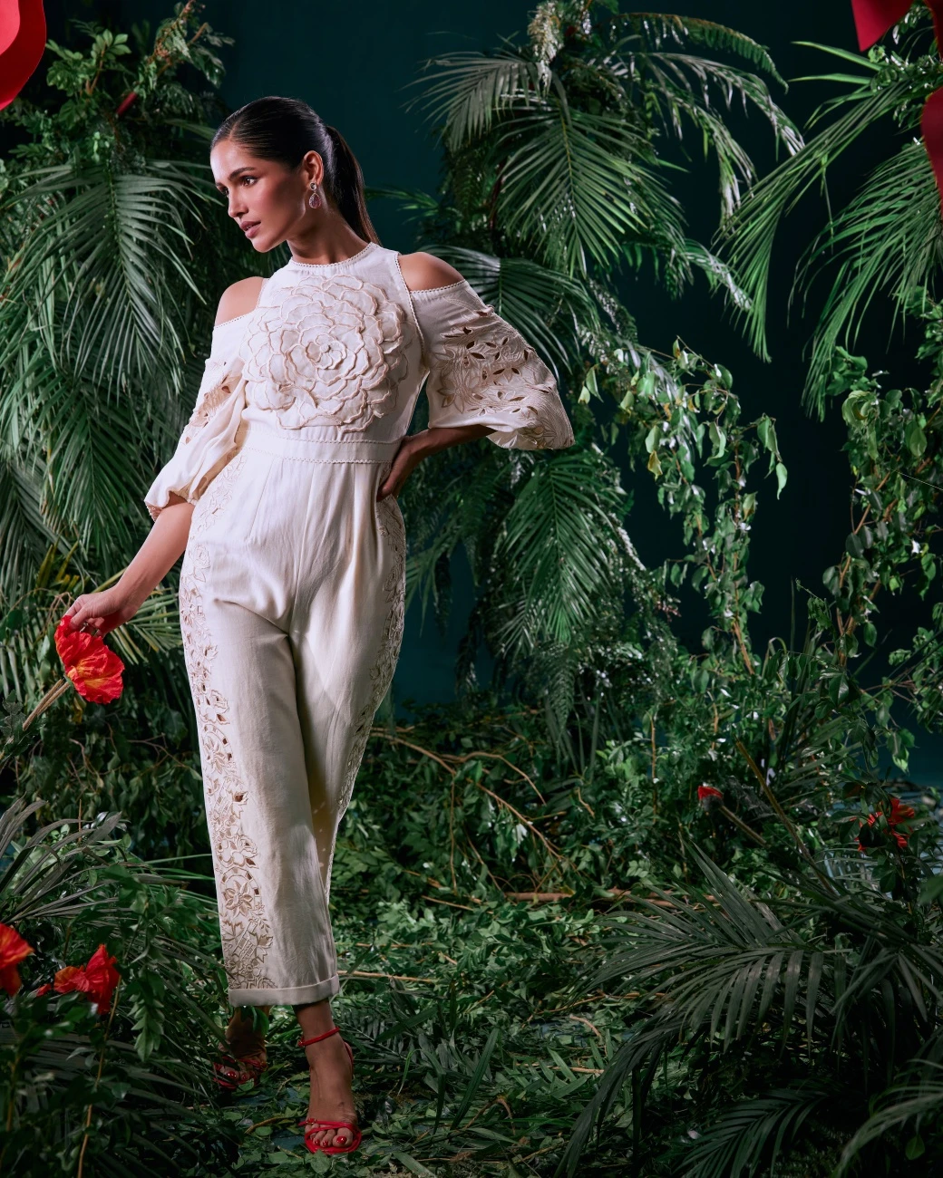 - Ivory Chanderi 3D Petal Applique And Cutwork Jumpsuit