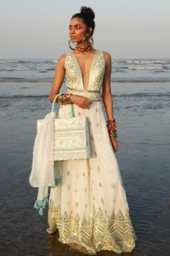 - Rihanna embroidered jumpsuit has a fitted bodice with v-neck and wide flared pant bottoms