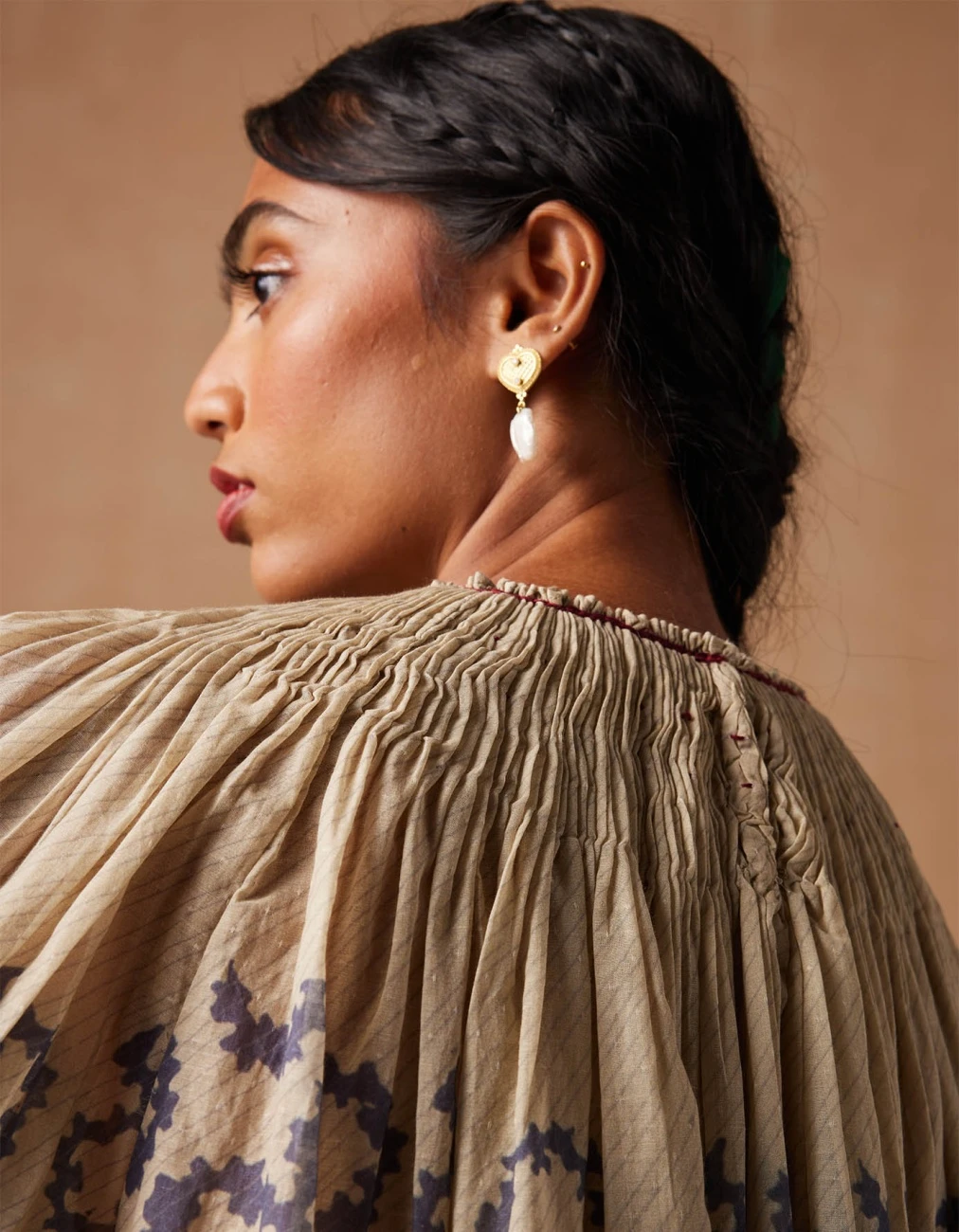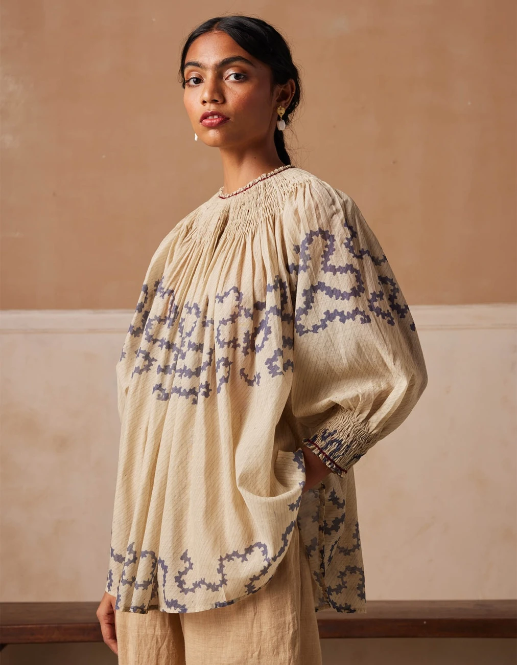 - The gathered top is made from 100% pure cotton featuring hand-gathered fabric on the neck and cuffs using contrast stitching to highlight the details