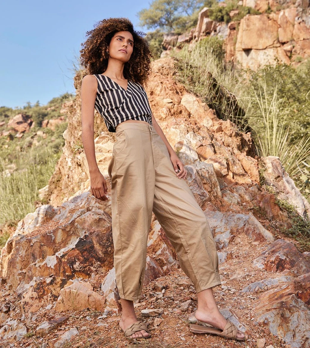 - A solid khaki brown pants with front button opening, side curve pockets and a pleated hem.