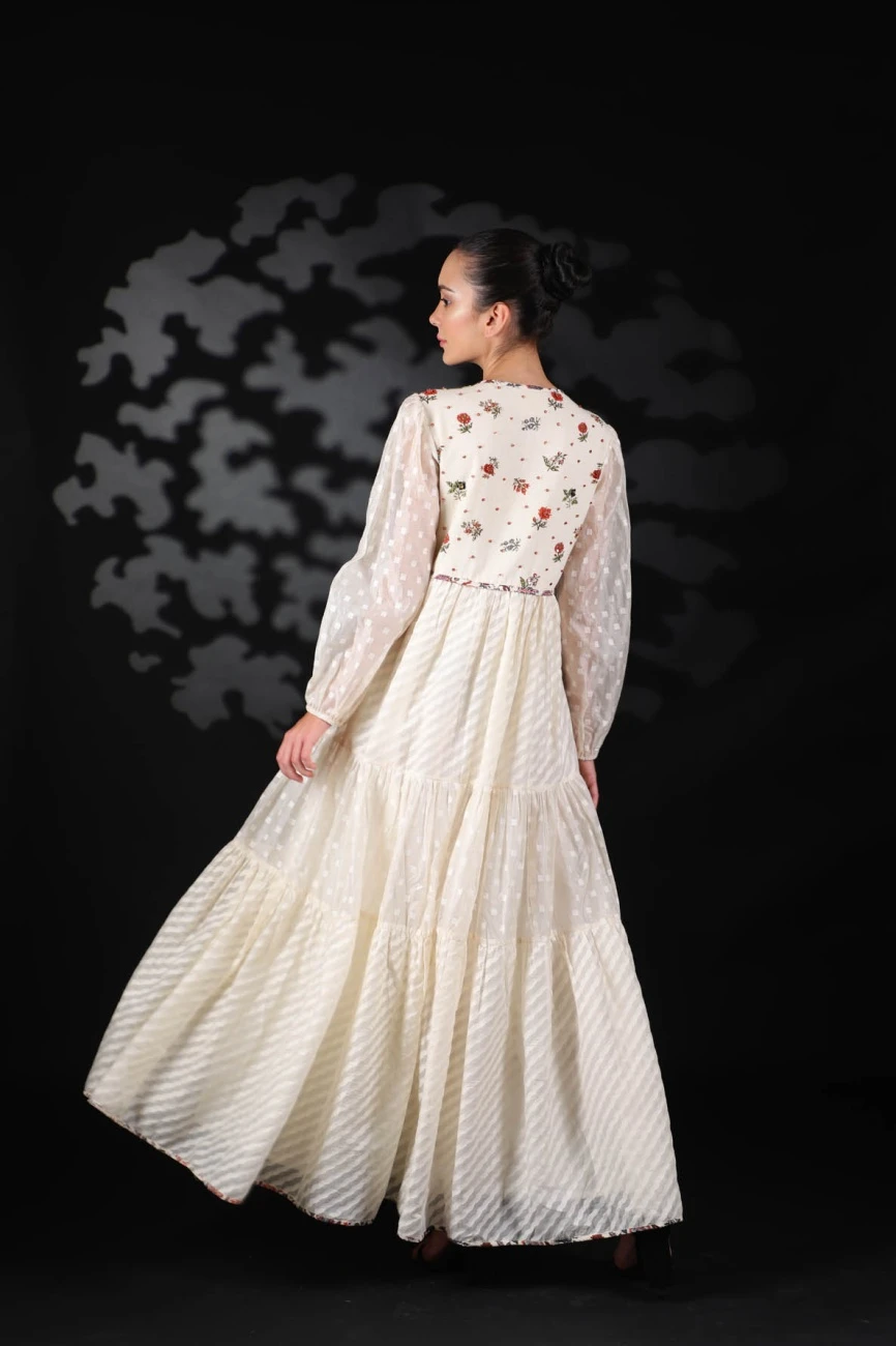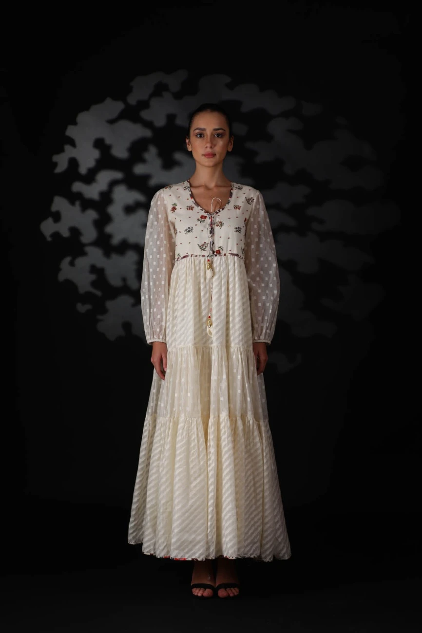 - Lilly Off White Handwoven Cotton Jamdani Hand Painted Chintz Print embroidered Yoke Tiered Dress with Hand Made tassels