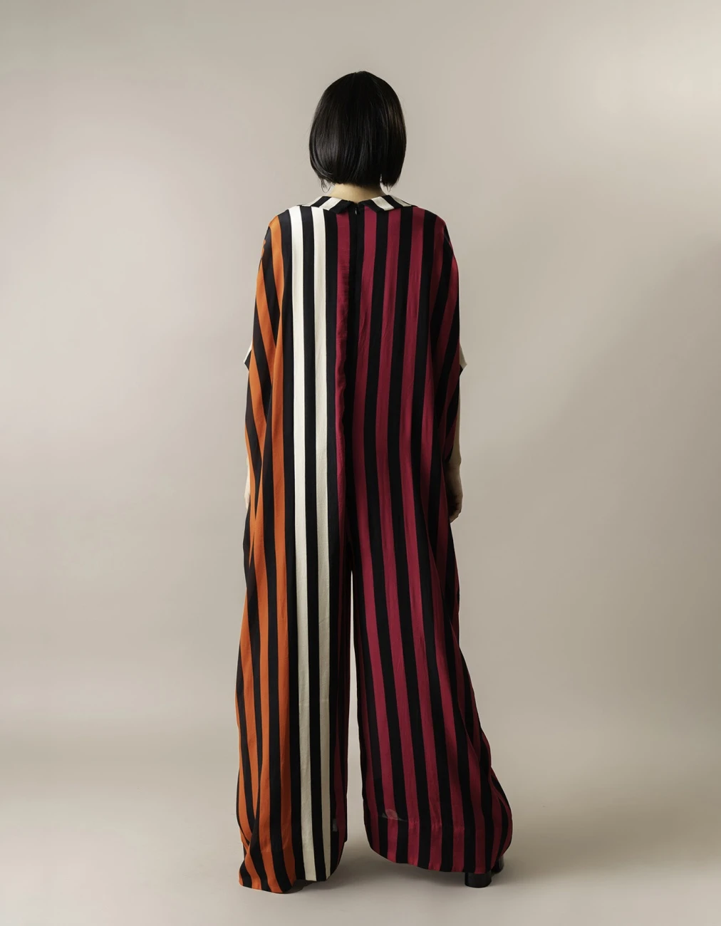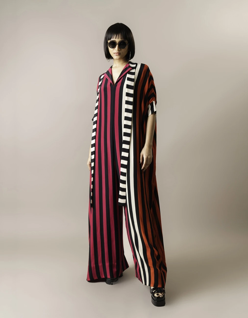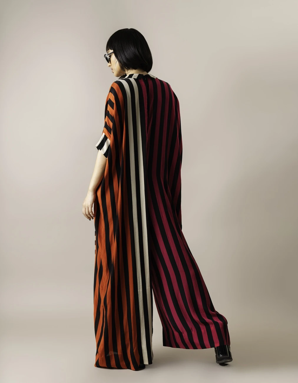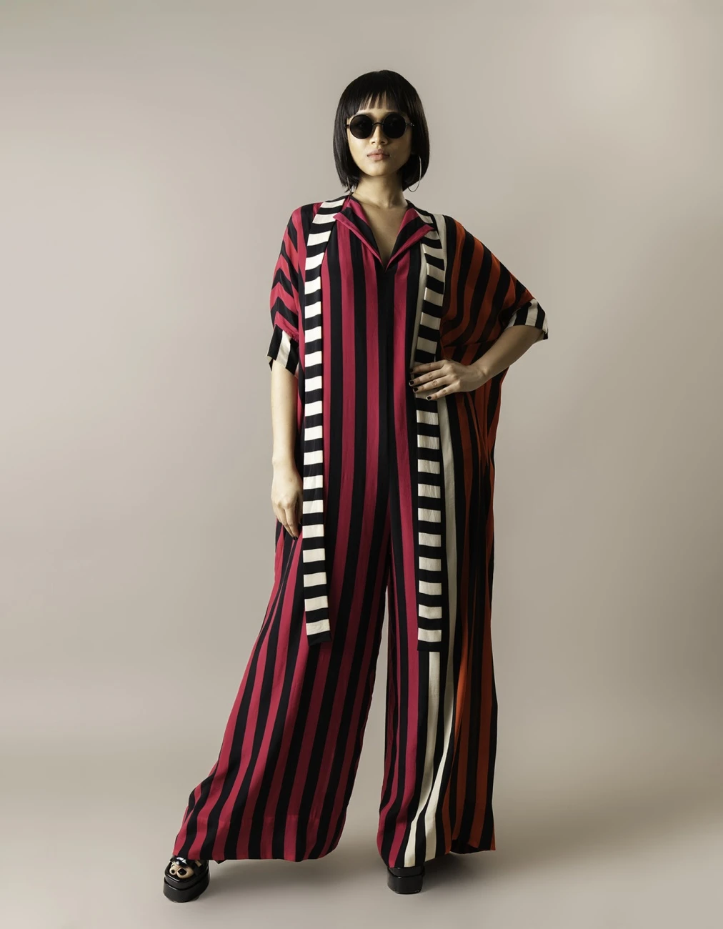 - Magenta Stripes Print On Crepe Kaftan Jumpsuit
