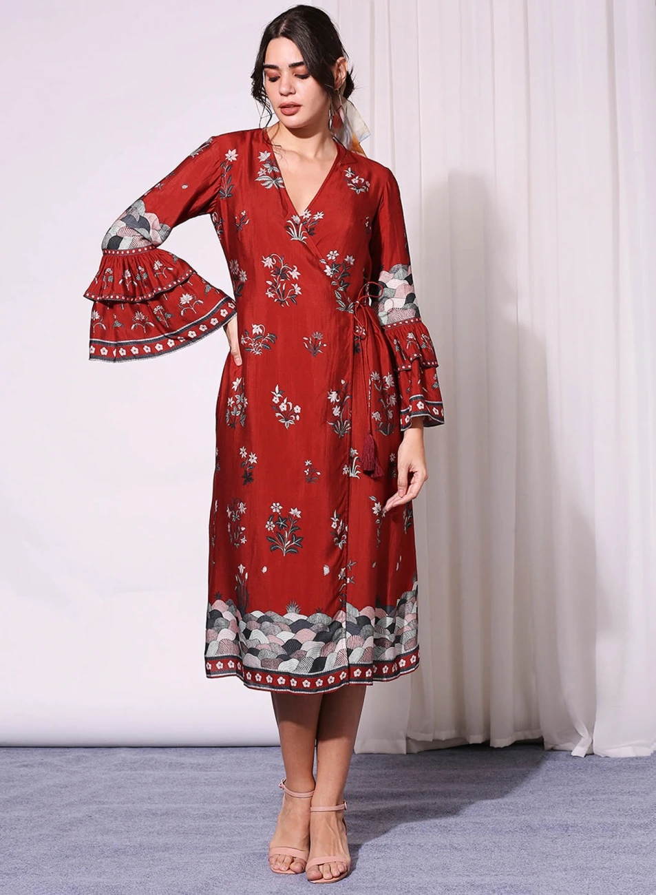 Merlot Red Overlap Printed Dress With Bell Sleeves