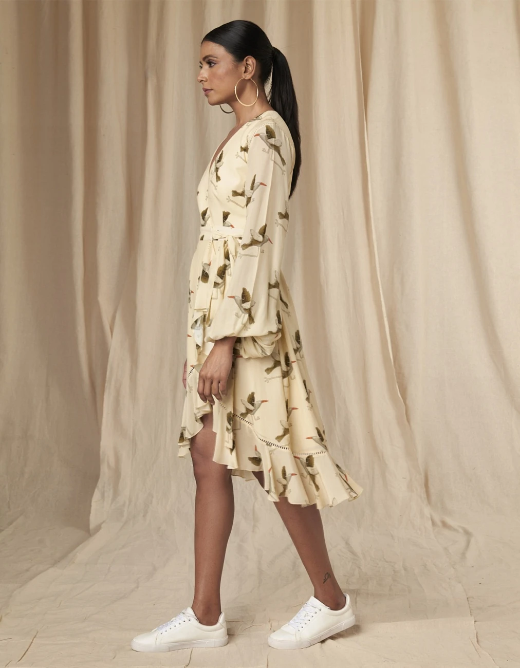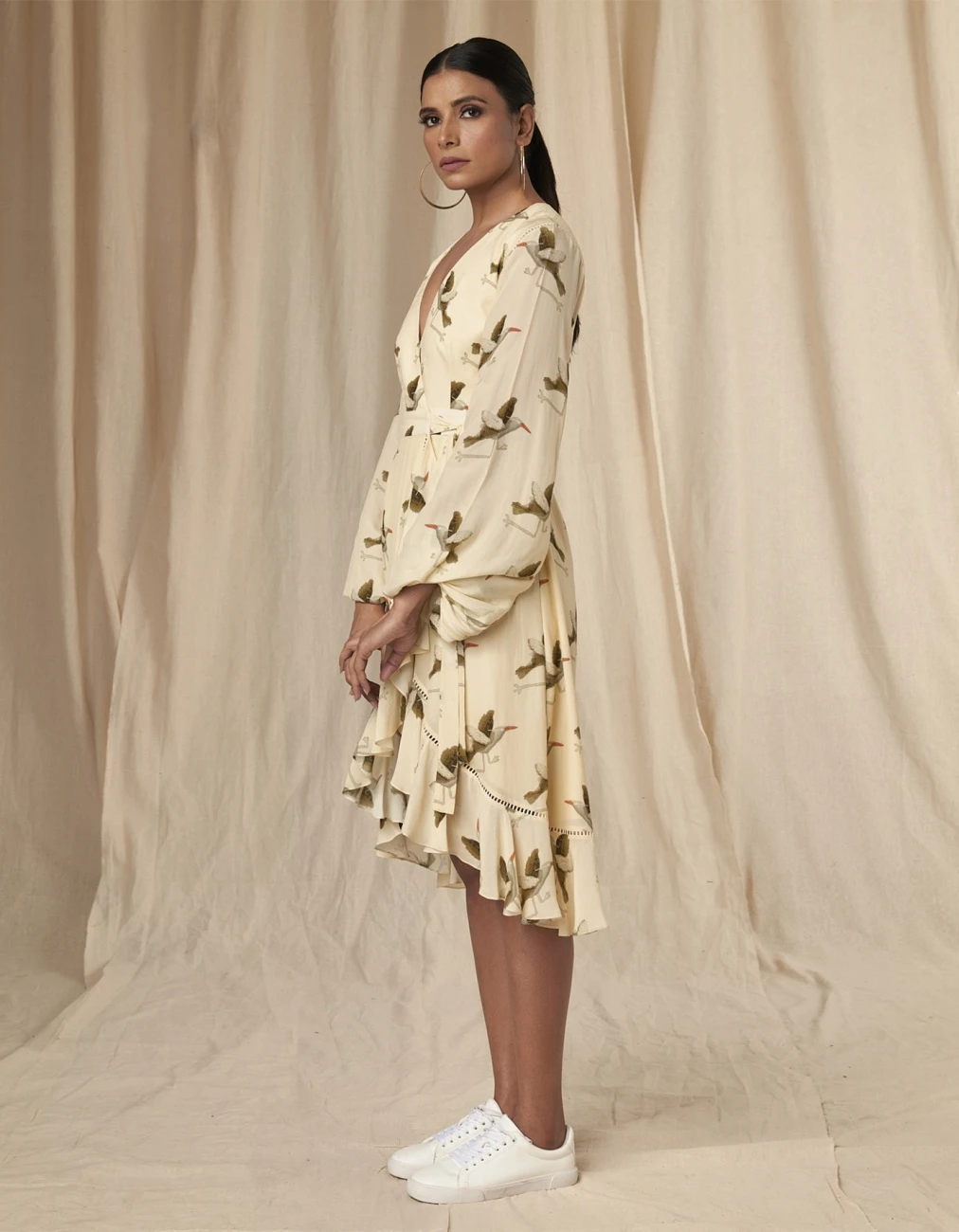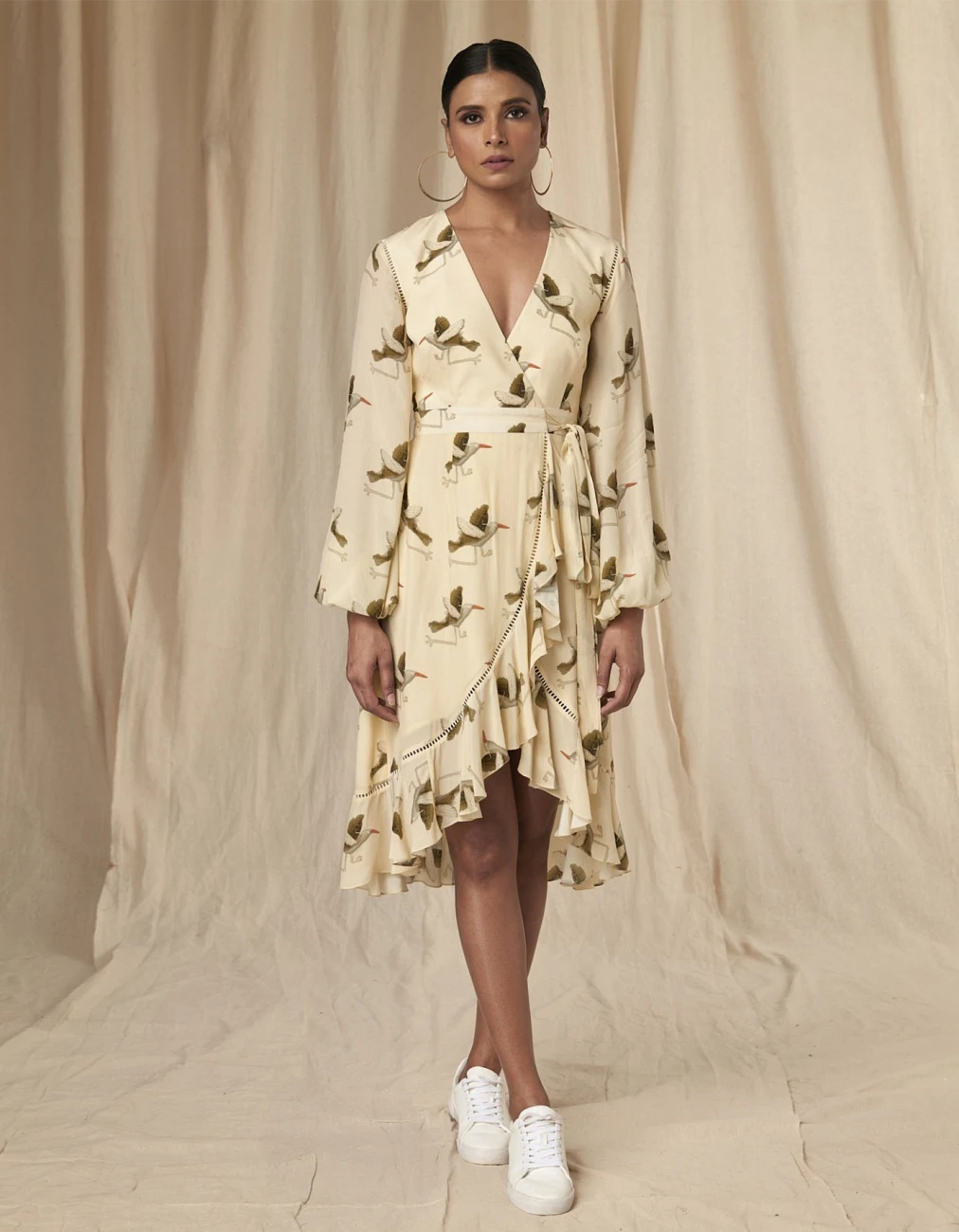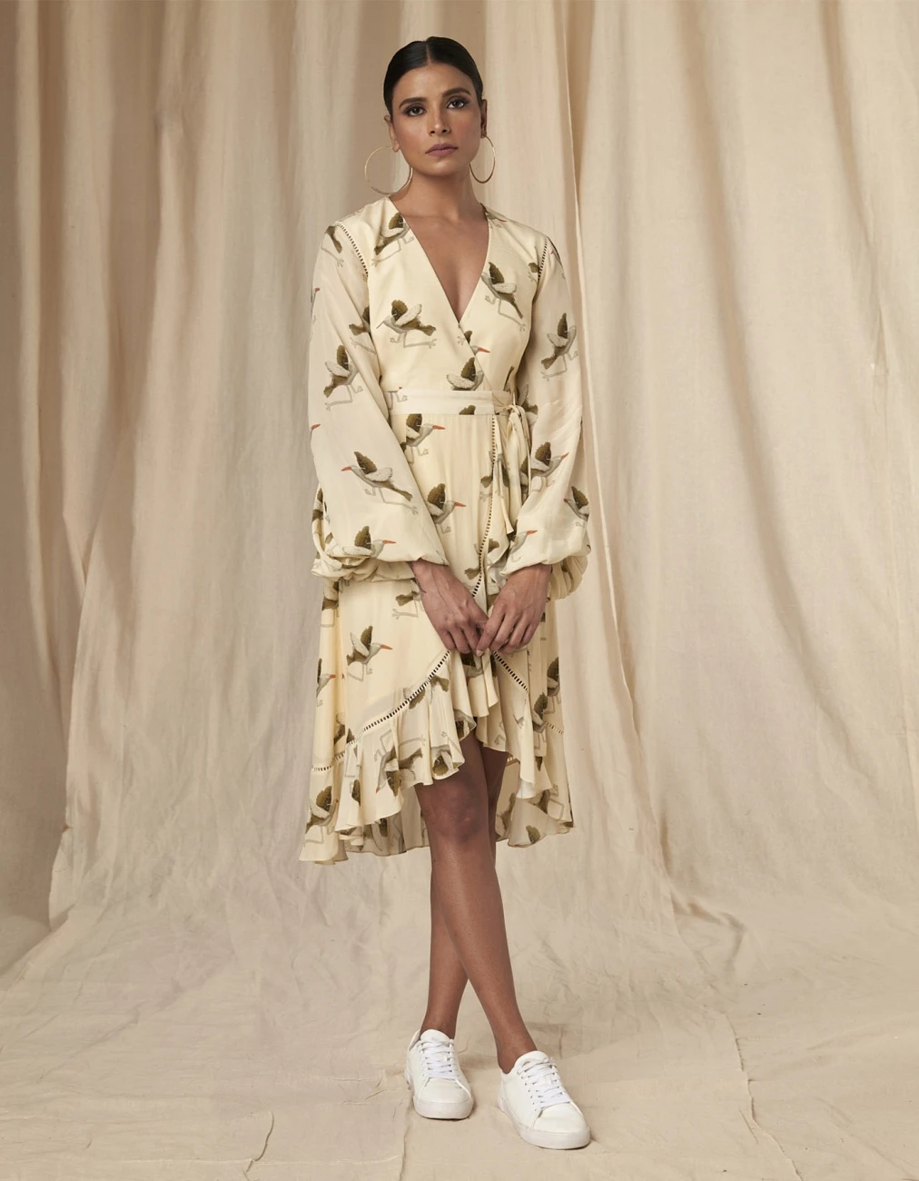 - Details – A- line | V-Neckline | Puff Sleeves | Elasticated hem adorned with ladder lace at armhole and frill