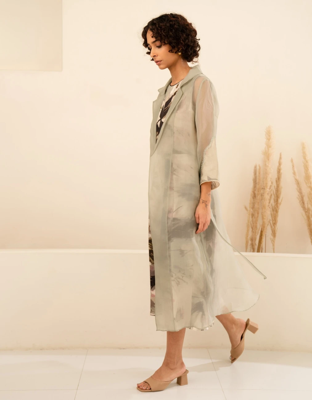 - Mint organza solid jacket + scattered petals linen jumpsuit
