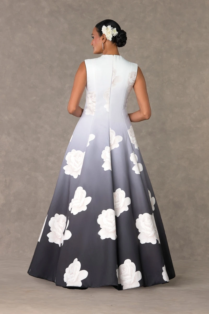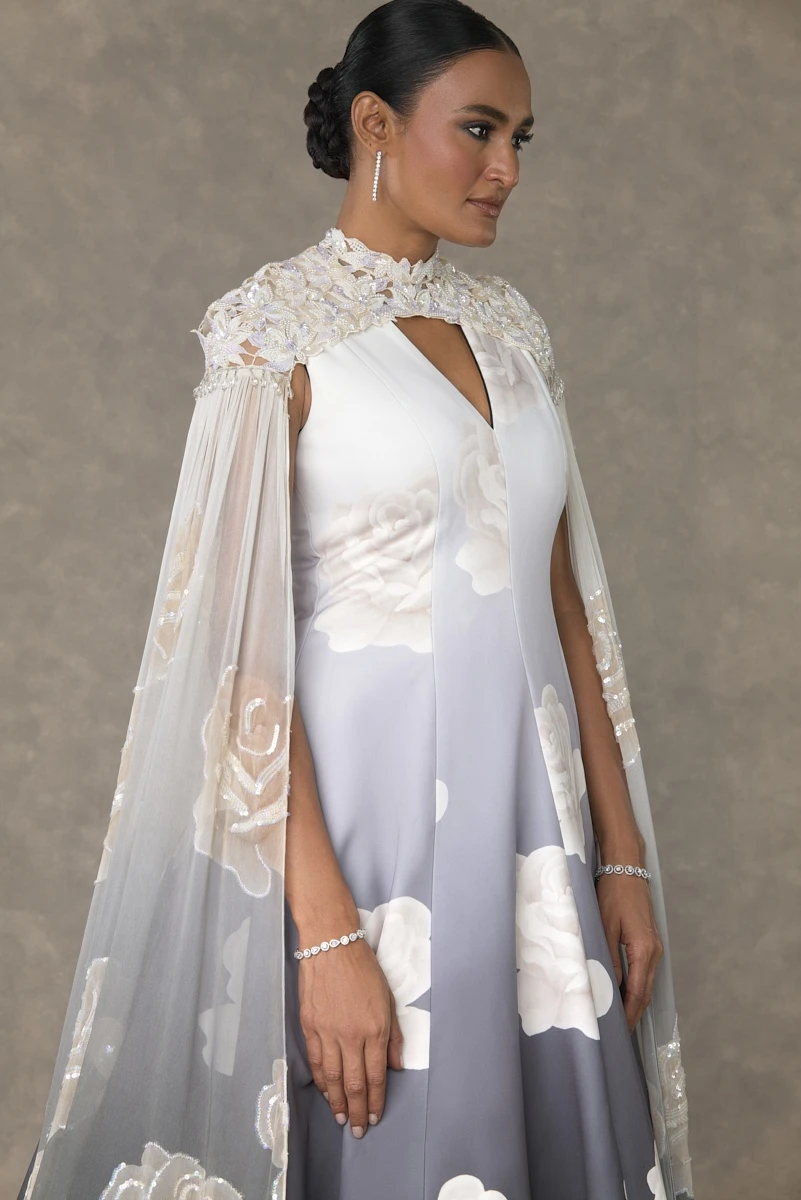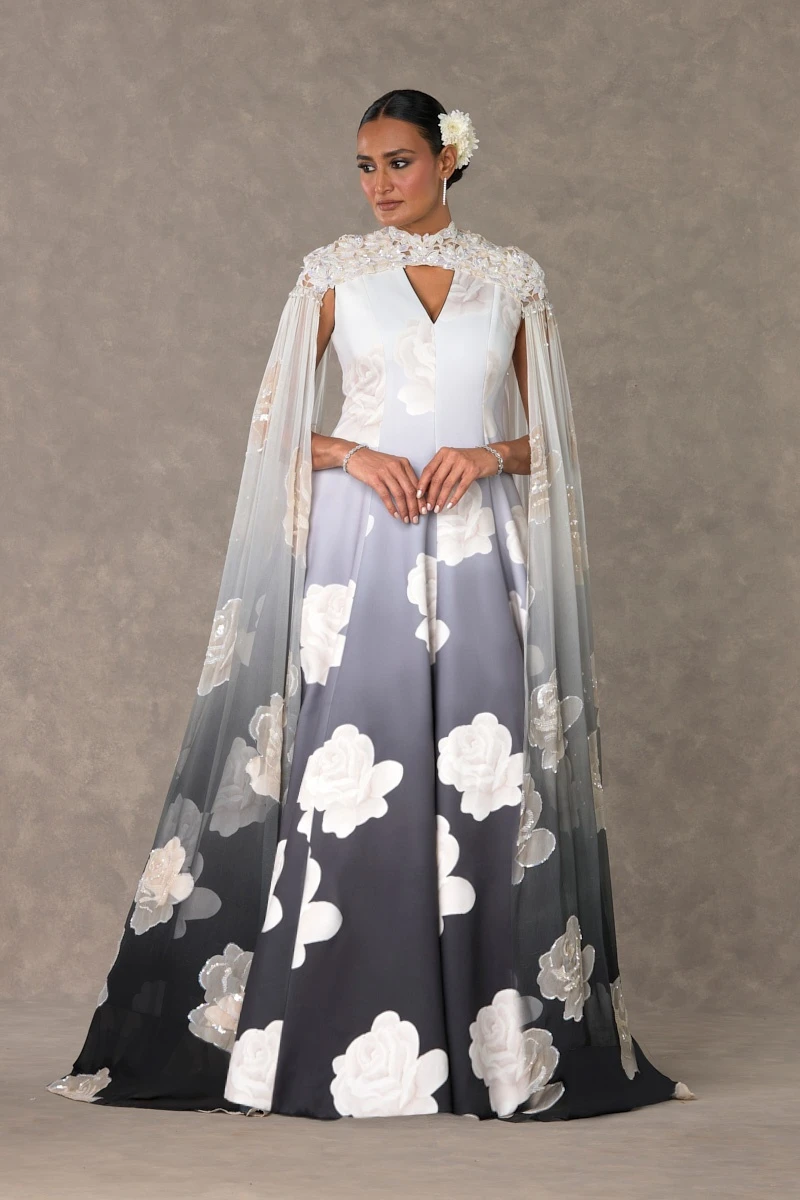 - Cape Cape with ombre monochrome digital print with sitara highlights , Cape with collar gracefully falling onto the shoulders with centre back closure