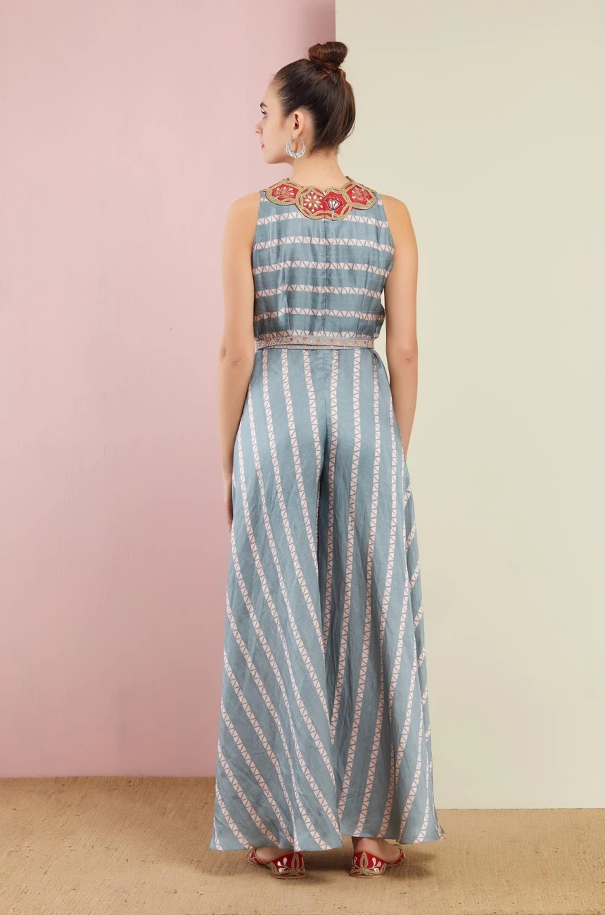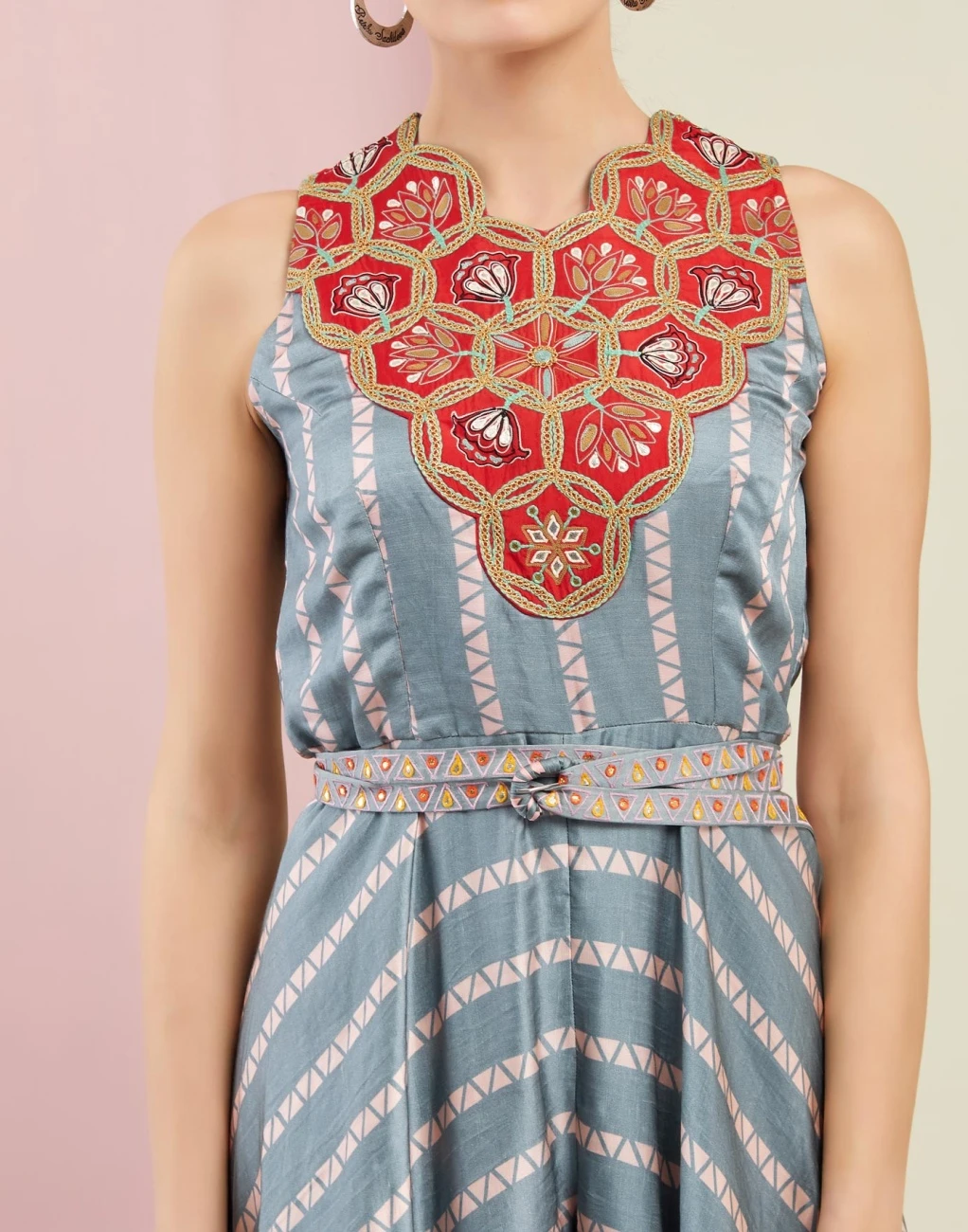 Inspired by the peacock gardens of India, these lively capes, drapes and separates are playfully elevated with bright block-printed motifs, resham and gota embroidery
