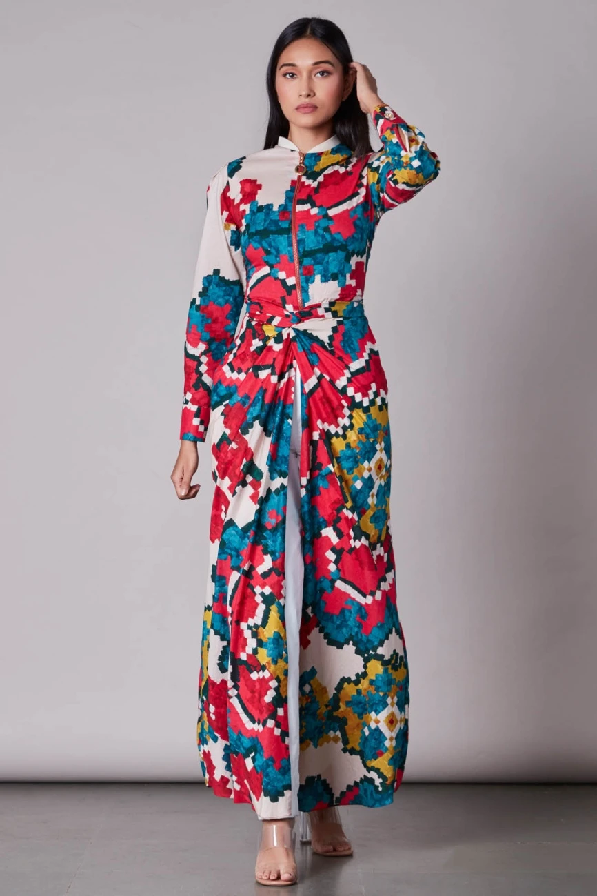 Multi Ikat Print Knot Detailed Jacket With Poplin Trousers