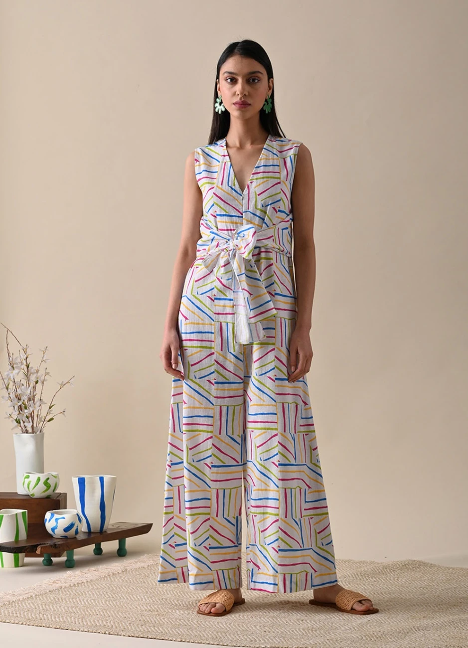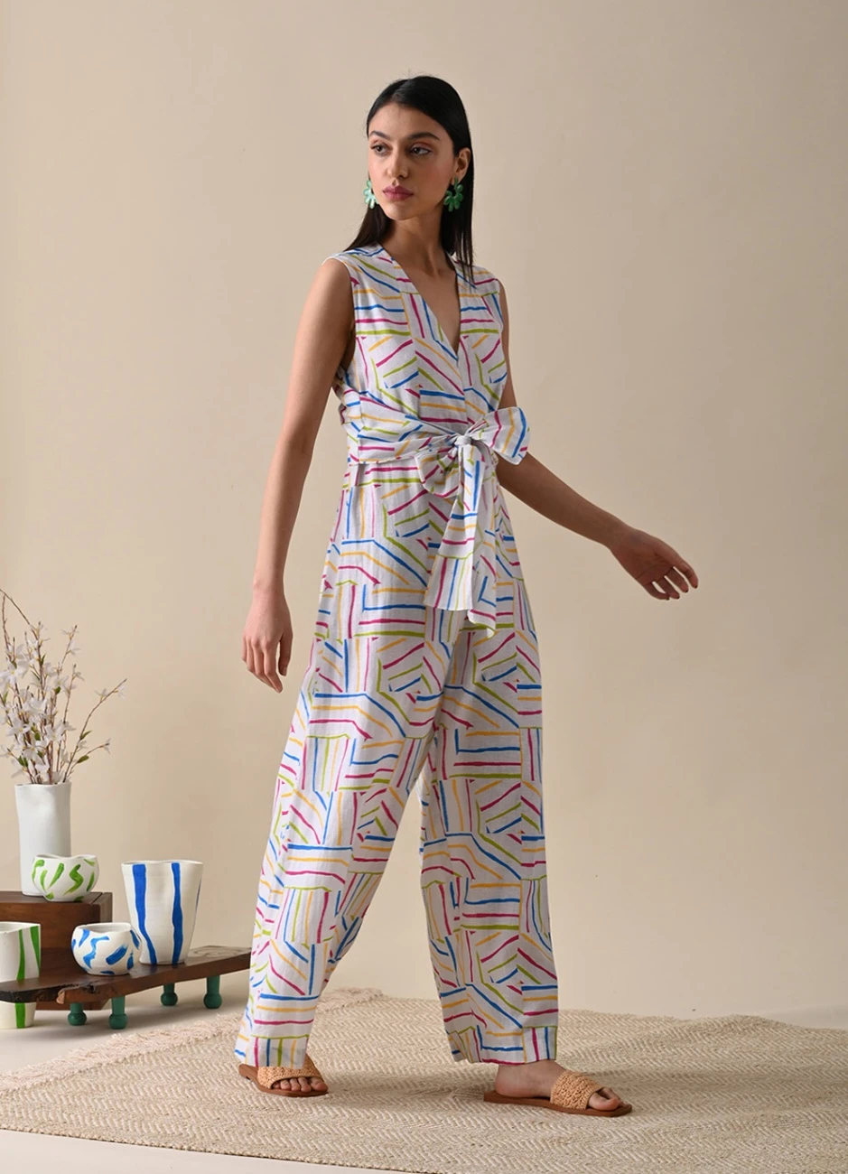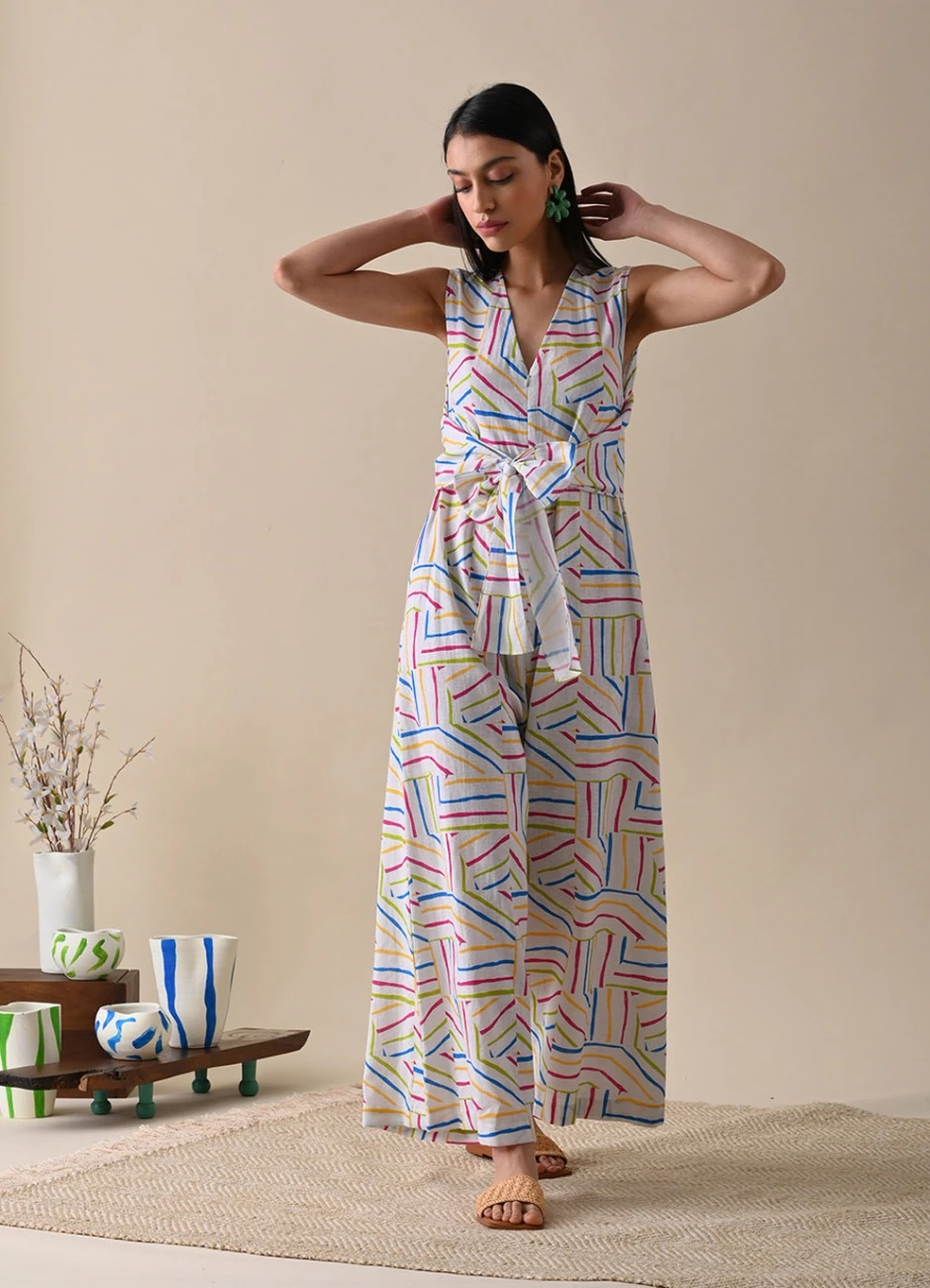 - Wide leg multi print jumpsuit with tie-up belt detail in front