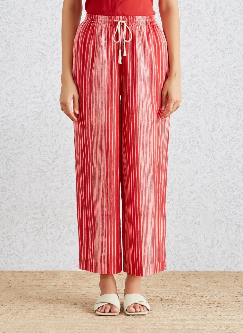 Effortless wardrobe pieces in vibrant reds, layered with intricate Shibori patterns