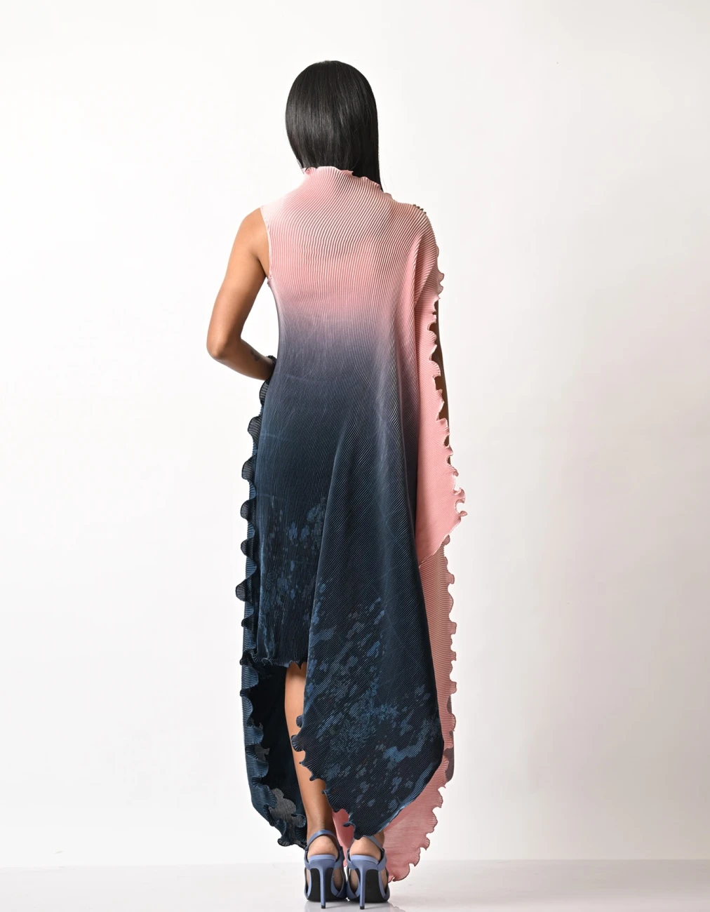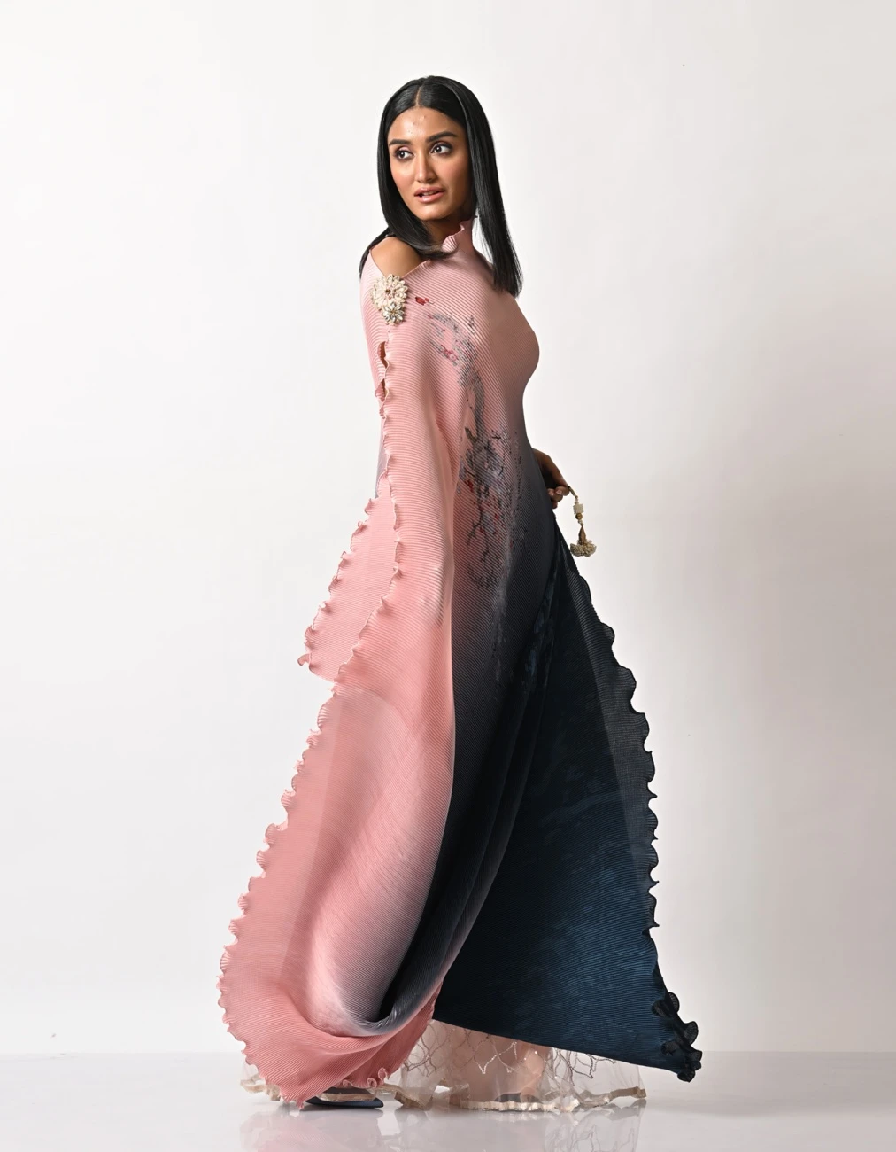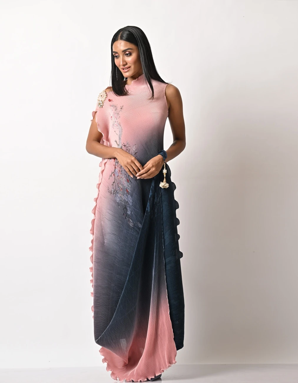 - Pink into navy parsi gada printed pleated drape with motif and tassel detail