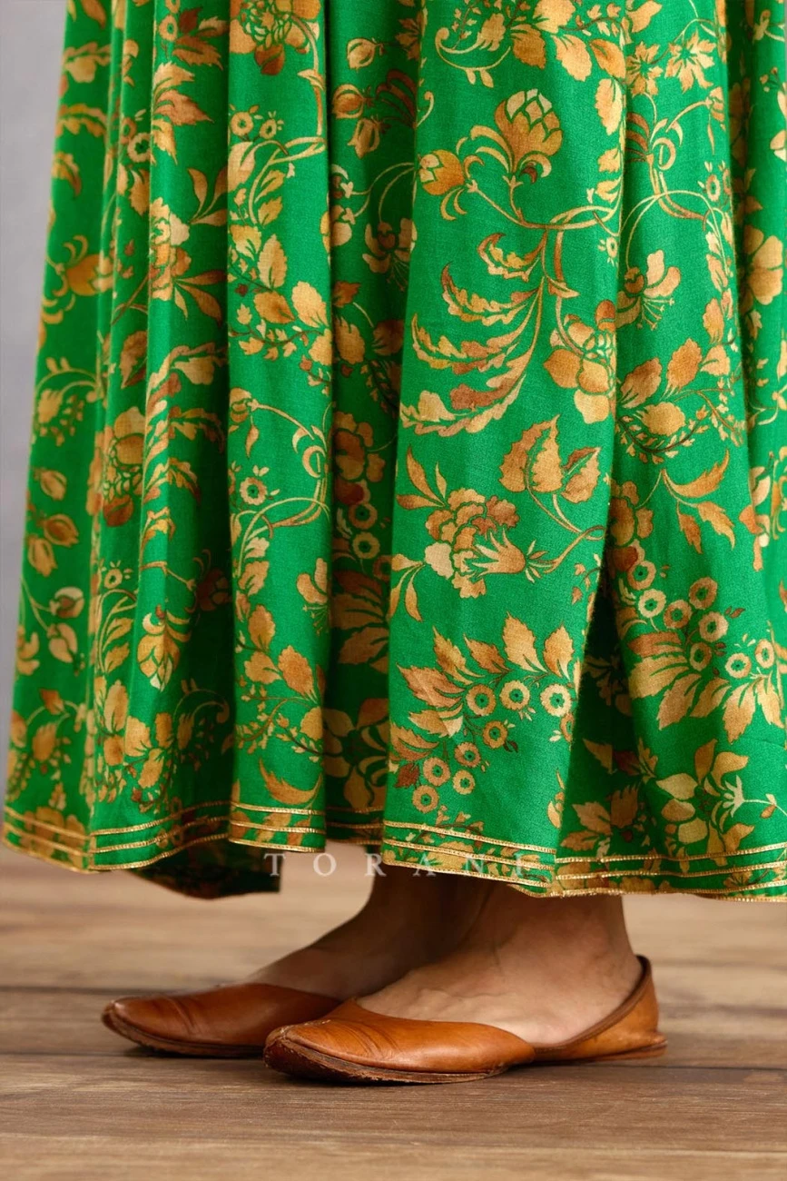- Rich Green Long Maxi Dresses With Chudidar Sleeves In Slub Silk