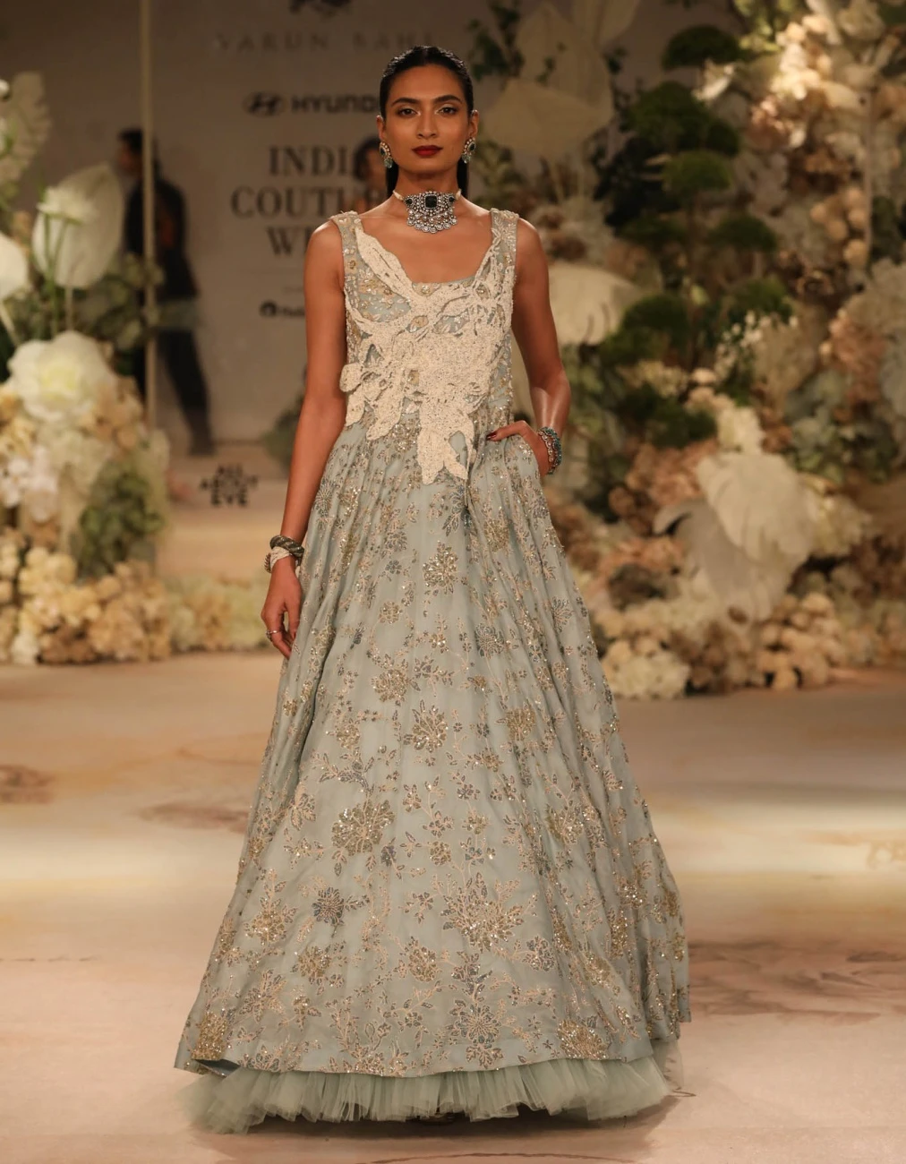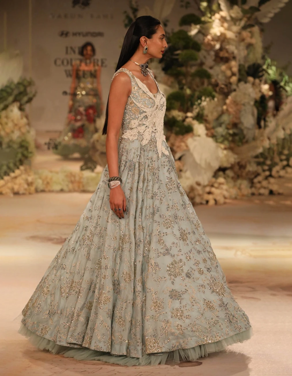 - This gown is crafted from silk organza and net, that boasts a delicate seafoam blue hue