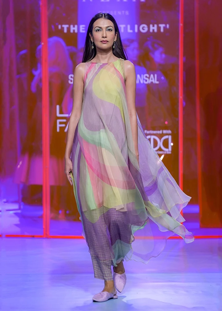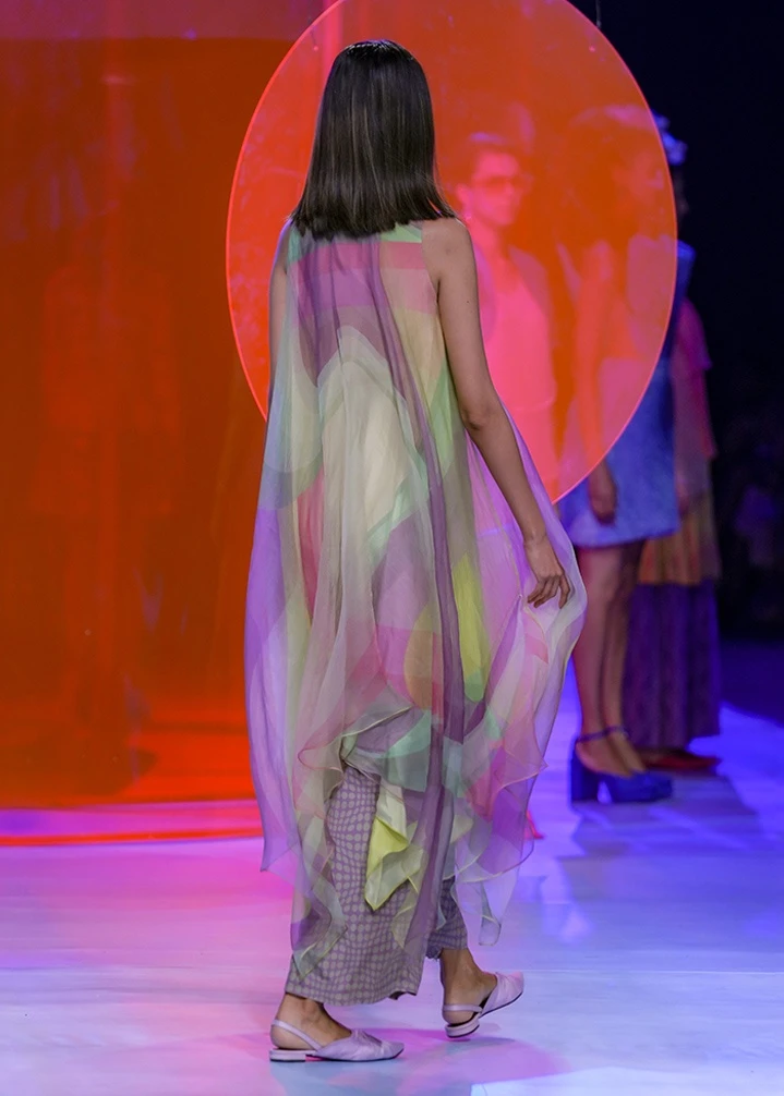 - Cromatic Wave Print Asymmetric Long Tunic Dress Paired With Printed Loose Plazzo Pants