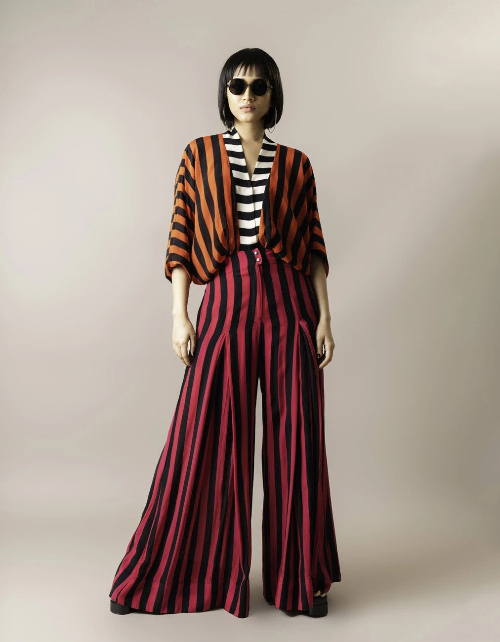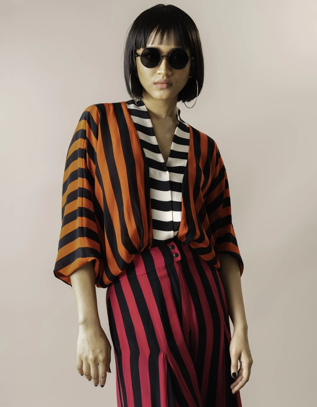 - Tangerine & Magenta Stripes Print On Crepe Kimono Ss Jumpsuit
