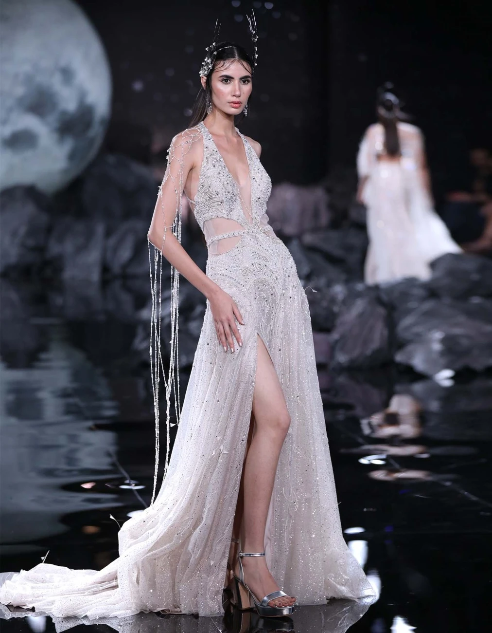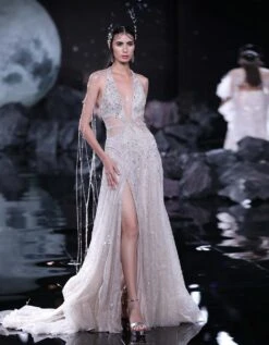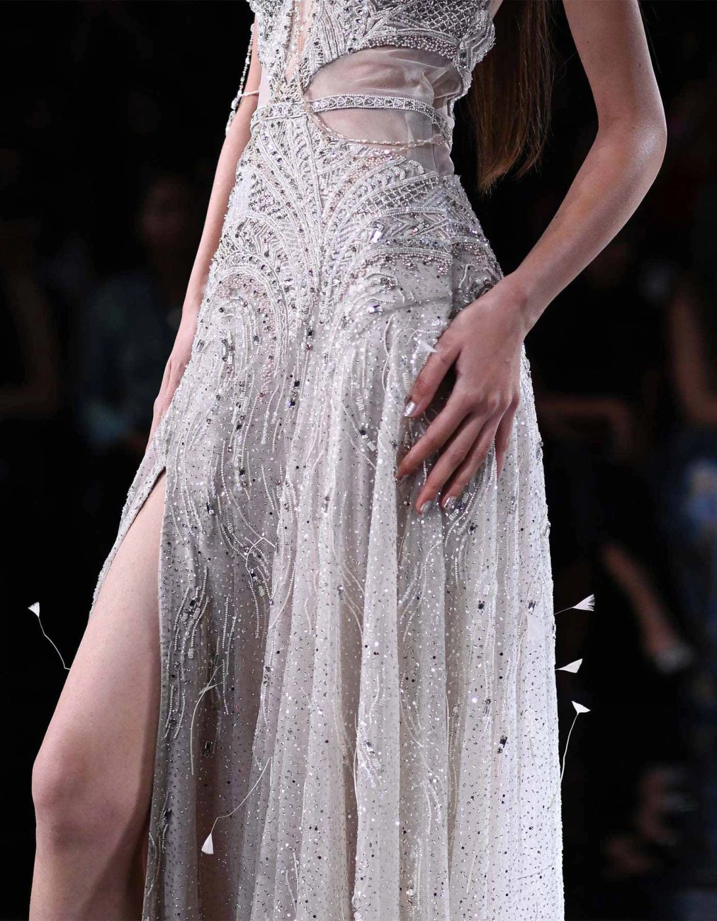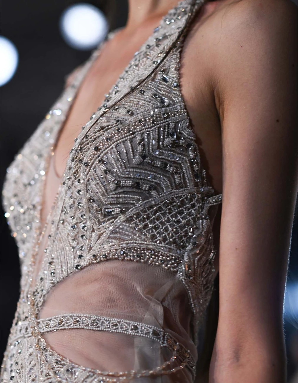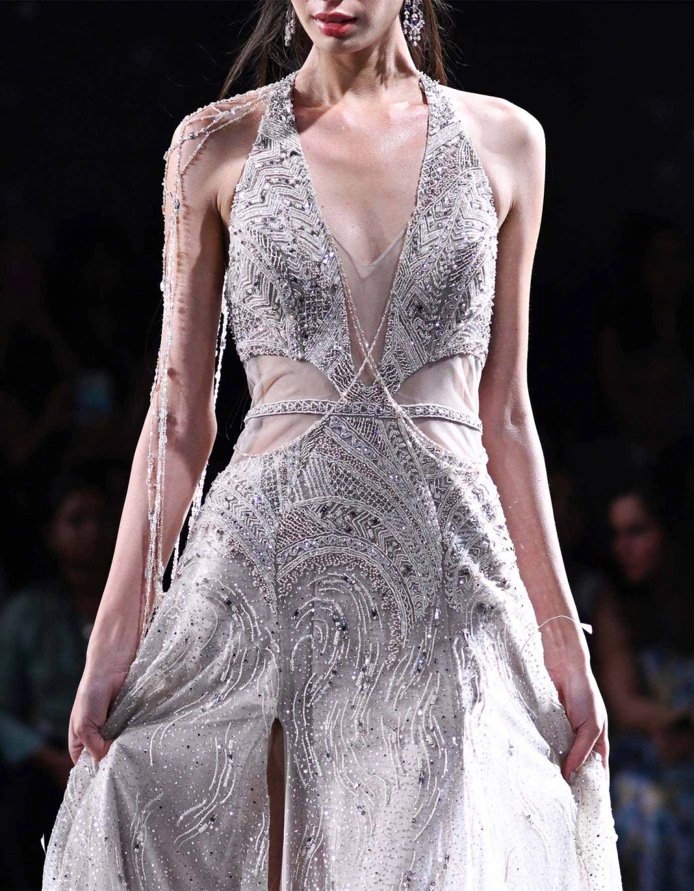 - Ivory shimmer tulle pearl and crystal encrusted.; Add Point 2 – Fitted cutout halter gown with thigh high slit, accentuated with pearl and crystal mesh sleeve