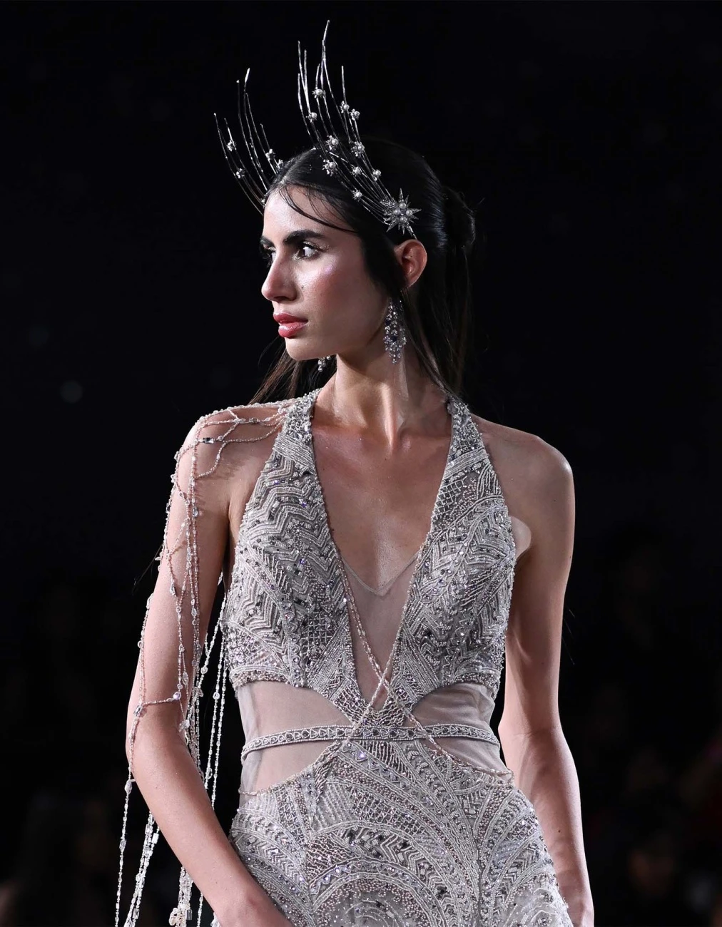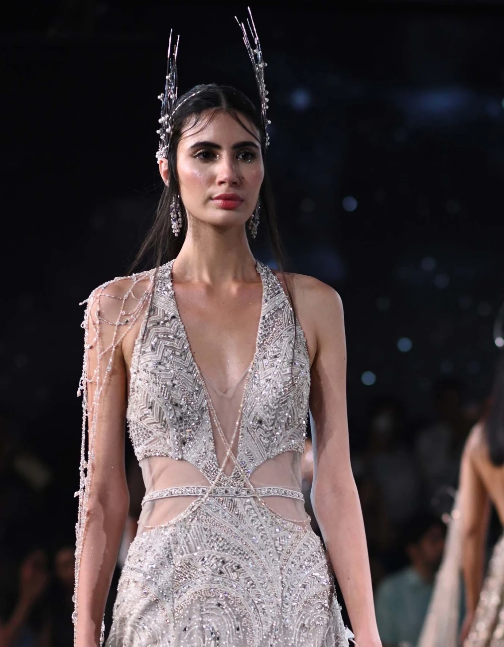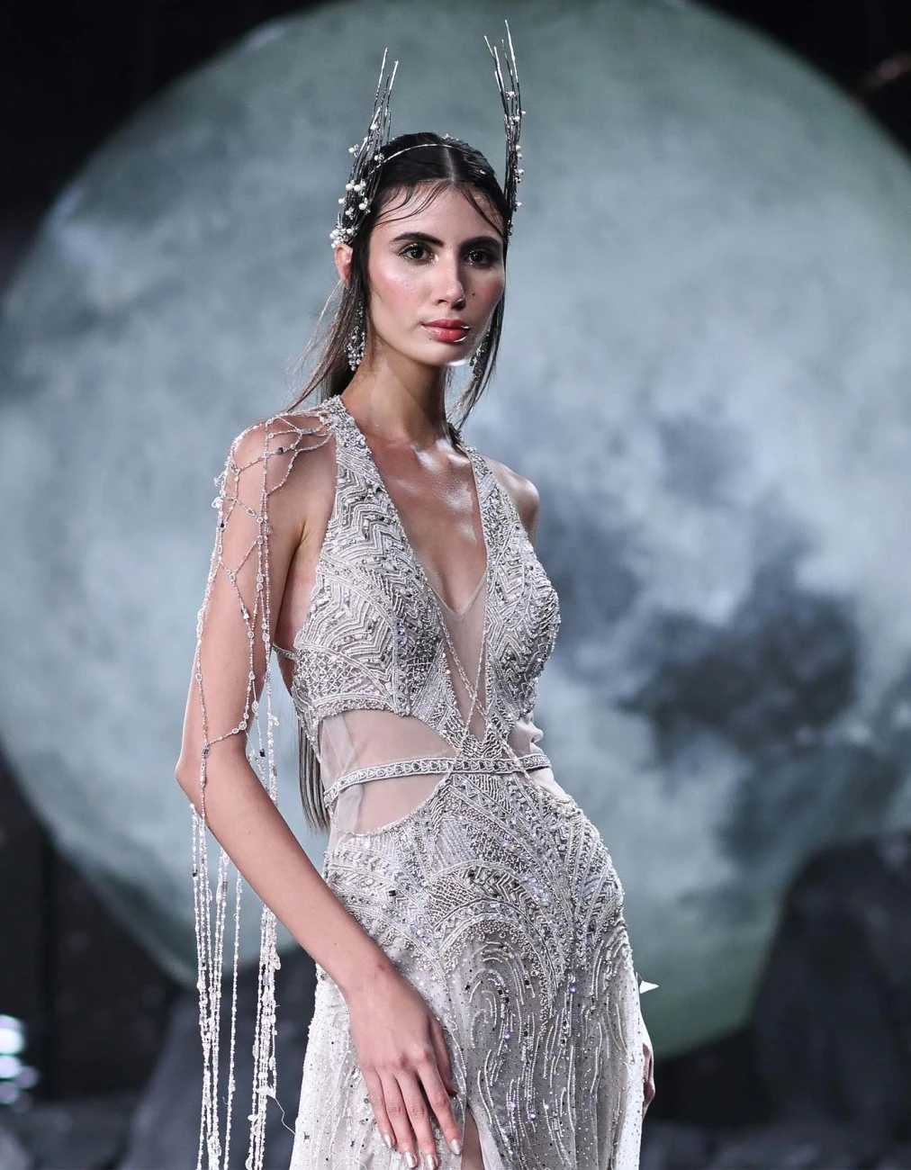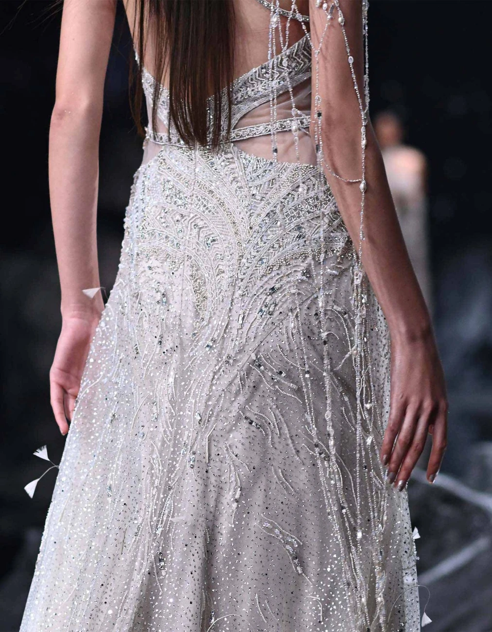 - Ivory shimmer tulle pearl and crystal encrusted.; Add Point 2 – Fitted cutout halter gown with thigh high slit, accentuated with pearl and crystal mesh sleeve