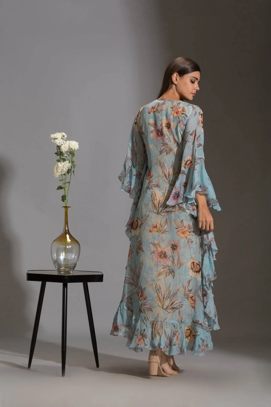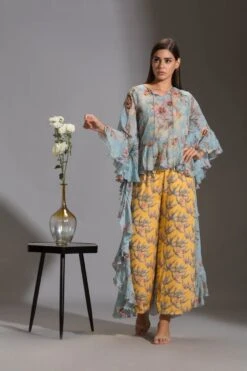 - Printed jumpsuit paired with printed asymmetrical top with frills