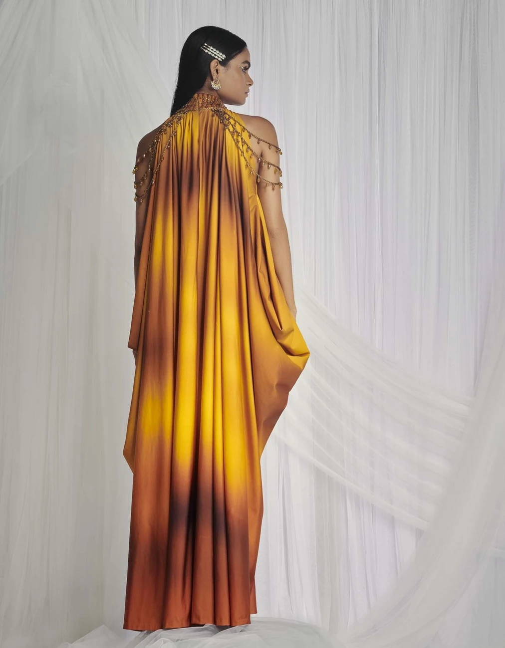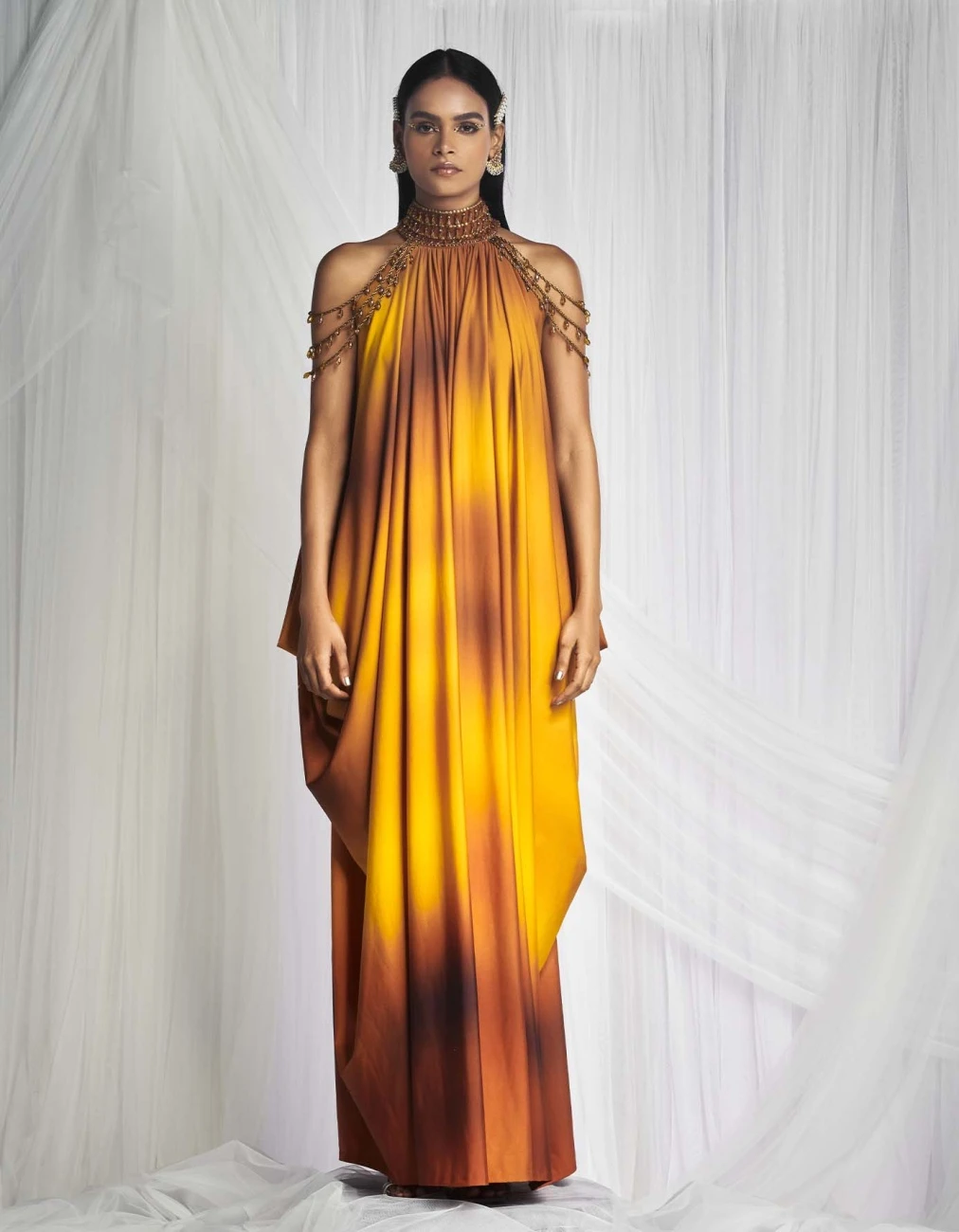 - Dyed gown accented with glass beaded embroidery around the collar in mala work